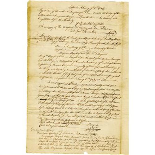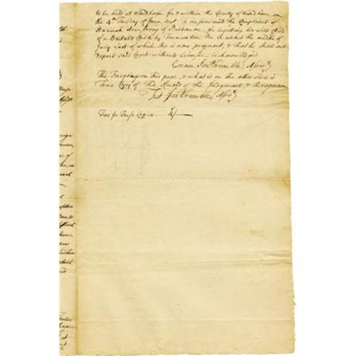 <B>Jonathan Trumbull Manuscript Document Signed</B></I> “<I>Jonth Trumbull Assist.</B></I>” <B>five times,</B></I> three pages, 7.5” x 12.25”, front and verso. Lebanon, Connecticut, February 2-7, 1744/5. Begins, “<I>To Jonathan Trumbull one of his Majesty's Assistants for the Colony of Connecticut, Comes Hannah Armstrong of Lebanon in the County of Windham Single Woman, and Complains and says that Benjamin Neguss of said Lebanon is guilty of having Carnal Knowledge of her Body, and begetting her with Child, of a Bastard Child by Fornication, on or about the Middle of the Month of July last part of which she is now pregnant, whereby the sd Hannah Armstrong is wronged and greatly Injured, and prays for Justice, and that the said Benjamin Neguss may be Arrested, and had before Authority to be Examined on the premises and Dealt with as to Law & Justice Appurtains…</B></I>” Hannah Armstrong has made “<I>her X mark</B></I>.” Trumbull orders the Sherriff of Wyndham County to arrest Neguss. He has signed this document “<I>Jonth Trumbull Assist</B></I>” five times, on all three pages, beneath statements of the constable who arrested Neguss, his plea, payment of a recognisance of £100, and order to appear, attesting that this document is a true copy of the original papers on file. Jonathan Trumbull became Governor of Connecticut in 1769 serving in that capacity until 1784. He was the only colonial Royal Governor to embrace the patriot cause and continued as first Governor of the new state. During the Revolutionary War, Trumbull was a friend and advisor to General Washington. Fine condition.<BR><BR><b>Shipping:</b> Flat Material, Small (<a target="_blank" href="http://www.heritageauctions.com/common/shipping.php">view shipping information</a>)