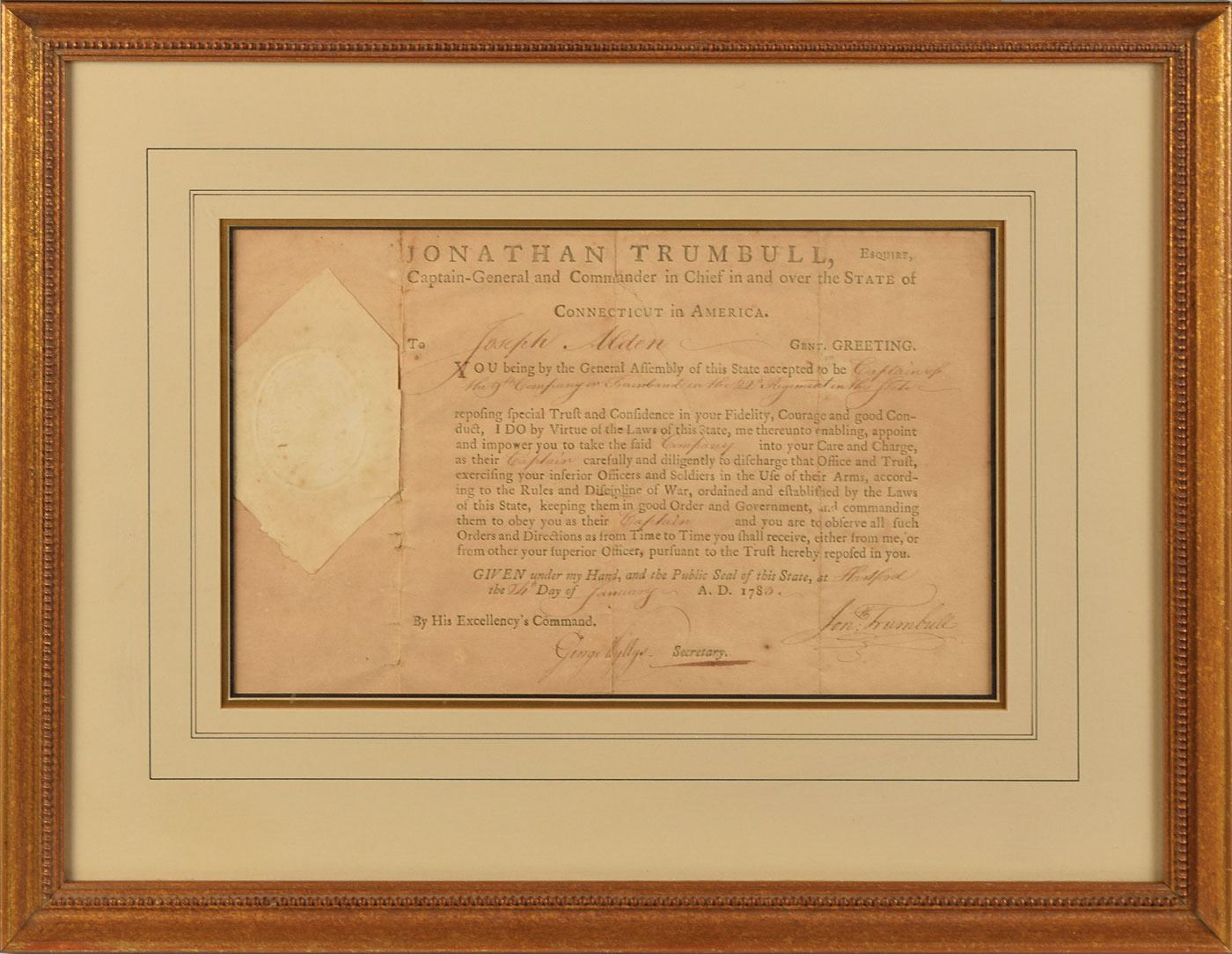 Governor of Connecticut who was the only colonial governor to side with the Americans during the Revolutionary War (1710–1785). Revolutionary War–dated partly-printed DS, signed “Jon;th Trumbull,” one page, 11.5 x 7, January 24, 1783. As governor of Connecticut, Trumbull appoints Joseph Alden as "Captain of the 9th Company or Trainband in the 22d Regiment in this State." Signed at the conclusion by Governor Trumbull and countersigned by George Wyllys as secretary. The white paper seal affixed to the left side remains partially intact. Matted and framed to an overall size of 18.25 x 14. In very good to fine condition, with creasing, and what appears to be a tear within the body of the document.