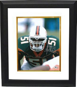 Jonathan Vilma stepped into the starting middle linebacker role and played an integral role on the Miami Hurricanes' National Championship team. He started 11 of 12 games during the regular season and was selected on the First-Team All-ACC team. In his final year, Vilma led the team in tackles for a third time with 127 (81 solo), with one sack, forced one fumble, and recovered three fumbles. Vilma ended the year as a finalist for the Butkus Award. Jonathan Vilma has hand autographed this Miami Hurricanes 8x10 Photo. Custom White Mat and Premium Black Frame as shown. FI Hologram and Certificate of Authenticity from Athlon Sports.