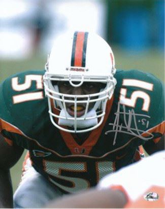 Jonathan Vilma stepped into the starting middle linebacker role and played an integral role on the Miami Hurricanes' National Championship team. He started 11 of 12 games during the regular season and was selected on the First-Team All-ACC team. In his final year, Vilma led the team in tackles for a third time with 127 (81 solo), with one sack, forced one fumble, and recovered three fumbles. Vilma ended the year as a finalist for the Butkus Award. Jonathan Vilma has hand autographed this Miami Hurricanes 8x10 Photo. FI Hologram and Certificate of Authenticity from Athlon Sports.