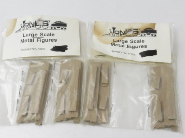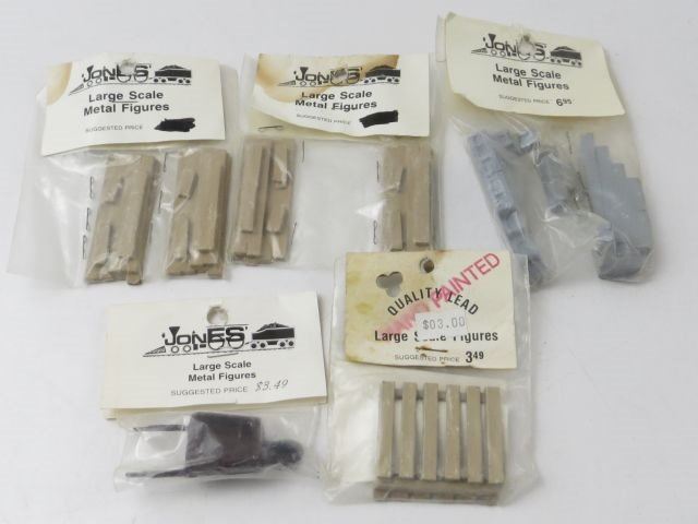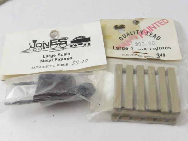 An assortment of Jones G scale train accessories in the original packages. There are lumber stacks, brick sections, a wheelbarrow, and pallets. Metal construction.