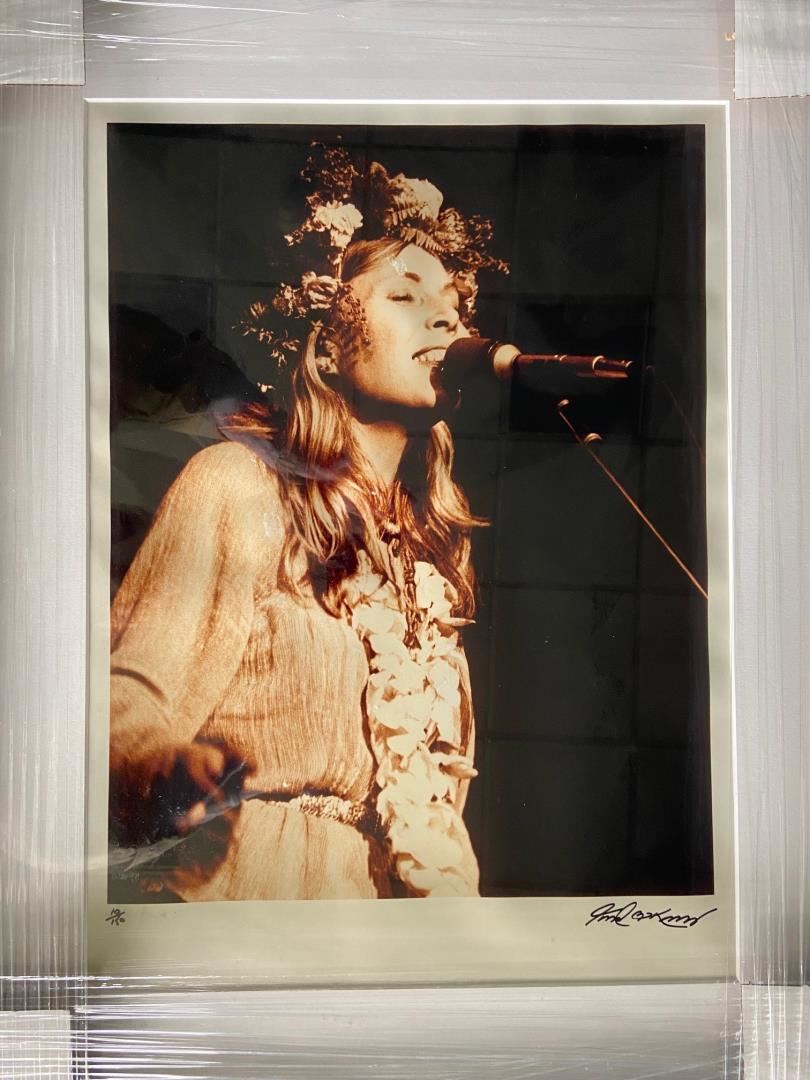 A FRAMED sepia- tone photo of Joni Mitchell signed by famed rock photographer Robert Knight. Framed it is 28x22.5",image 21x16