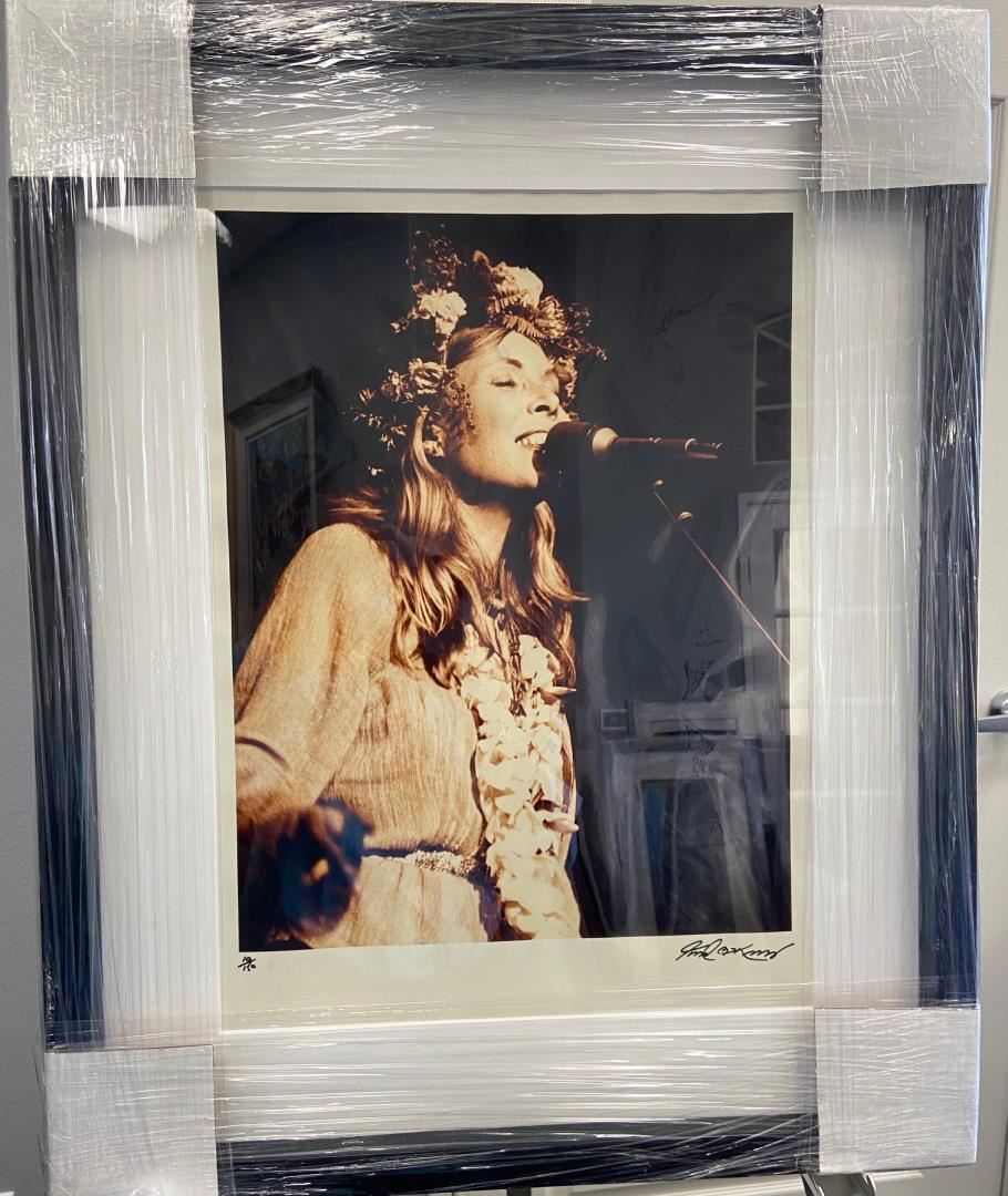 A FRAMED sepia- tone photo of Joni Mitchell signed by famed rock photographer Robert Knight. Framed it is 28x22.5",image 21x16