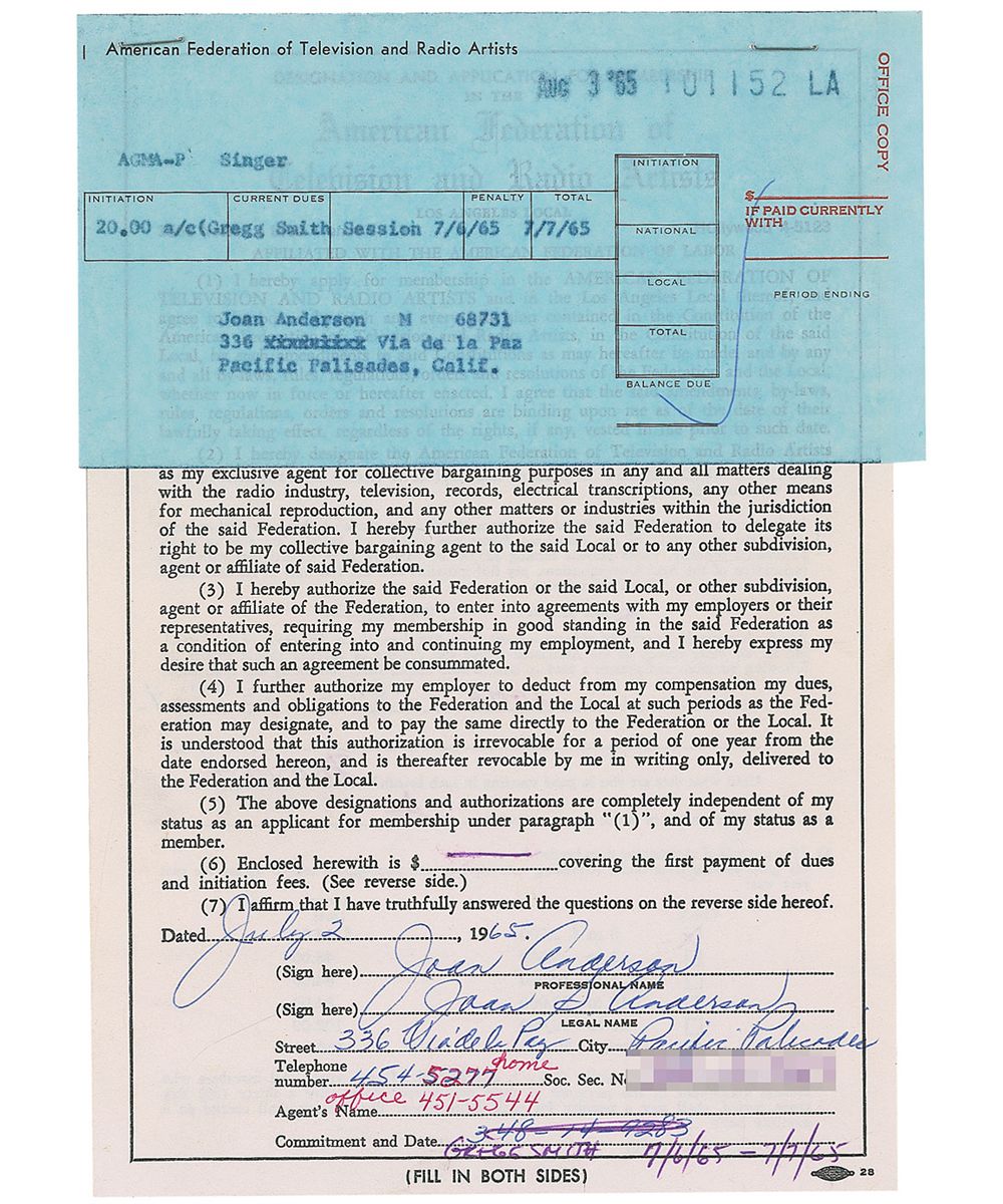 Rare DS, signed “Joan Anderson” and “Joan S. Anderson,” one page both sides, 6 x 8.75, July 2, 1965. AFTRA membership application, filled out by Mitchell who lists her “professional name” as “Joan Anderson,” and her “legal name” as “Joan S. Anderson,” as well an address in Pacific Palisades. The rest is filled out by her representative, “Gregg Smith,” listing her occupation as “Singer” and gross income as between $0 and $2000. An AFTRA office receipt is stapled to the top. In fine to very fine condition. An especially interesting document, as union dues were part of what drove her to the United States—as a young folk singer in Toronto, Mitchell couldn’t afford the $160 union fee required to play at the most profitable locations along the vibrant folk circuit and so was relegated to less popular venues. She married Chuck Mitchell in June 1965, taking his surname. An especially early document signed twice with her given name, this is a truly spectacular find.