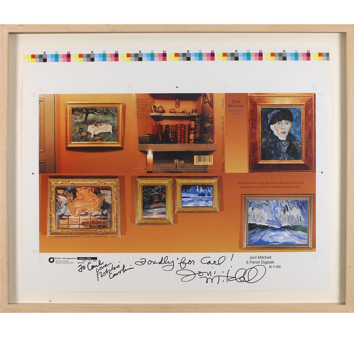 CD cover proof for her Turbulent Indigo album, 19 x 16, signed and inscribed in the lower border in black felt tip, “Fondly for Carl! Joni Mitchell,” and also signed and inscribed by Robbie Cavolina. Framed to an overall size of 22 x 18. In fine condition.