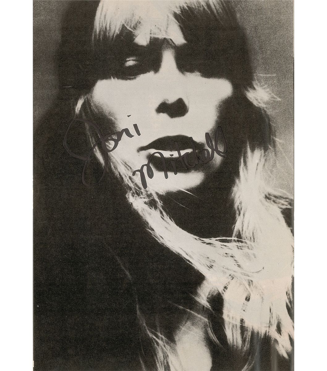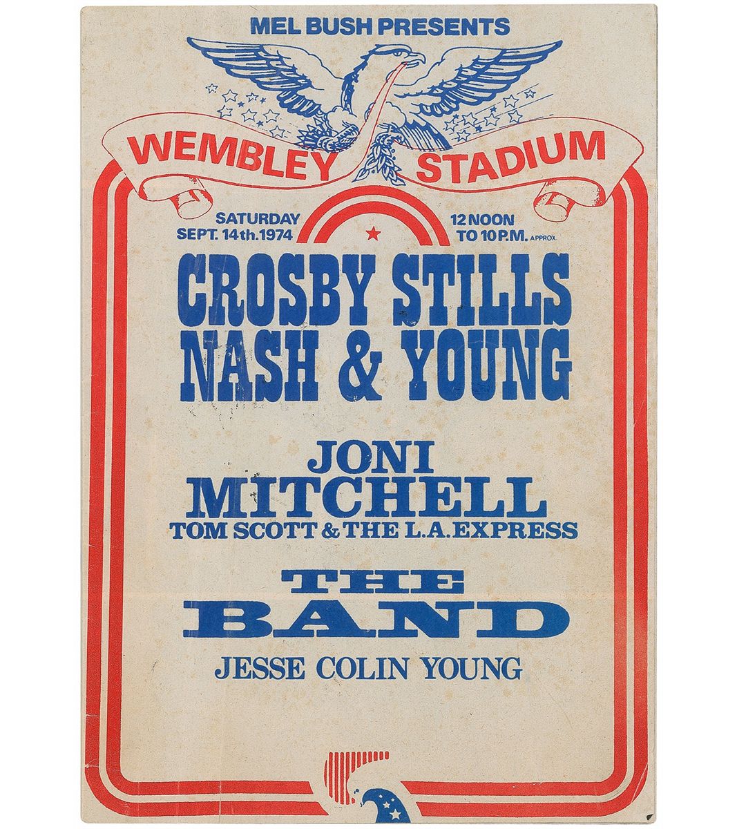 Program for performances by CSNY, Joni Mitchell, and the Band at Wembley Stadium on September 14, 1974, 8.25 x 11.5, signed inside on a full-page image in black felt tip by Mitchell. In very good condition, with scattered foxing and creases to the cover, and fair contrast to portions of the signature against the dark background.