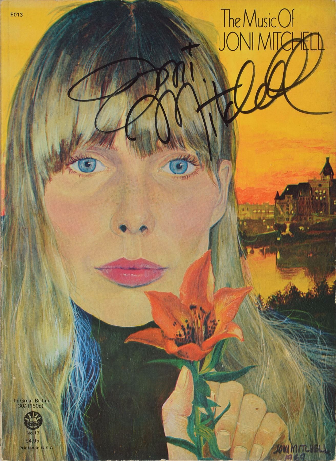 Signed book: The Music of Joni Mitchell. NY: Siquomb Publishing, 1969. Softcover, 8 x 11, 128 pages. Signed on the front cover in black felt tip. In fine condition, with some wear to spine.