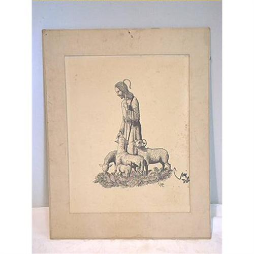 Good Shepherd holding a staff with His sheep around him eating grass. This sketch or print is signed Joni with PTL below her name and has this on there 2 times. The print measures 14 inches wide and 18 inches high and is in very good condition.
