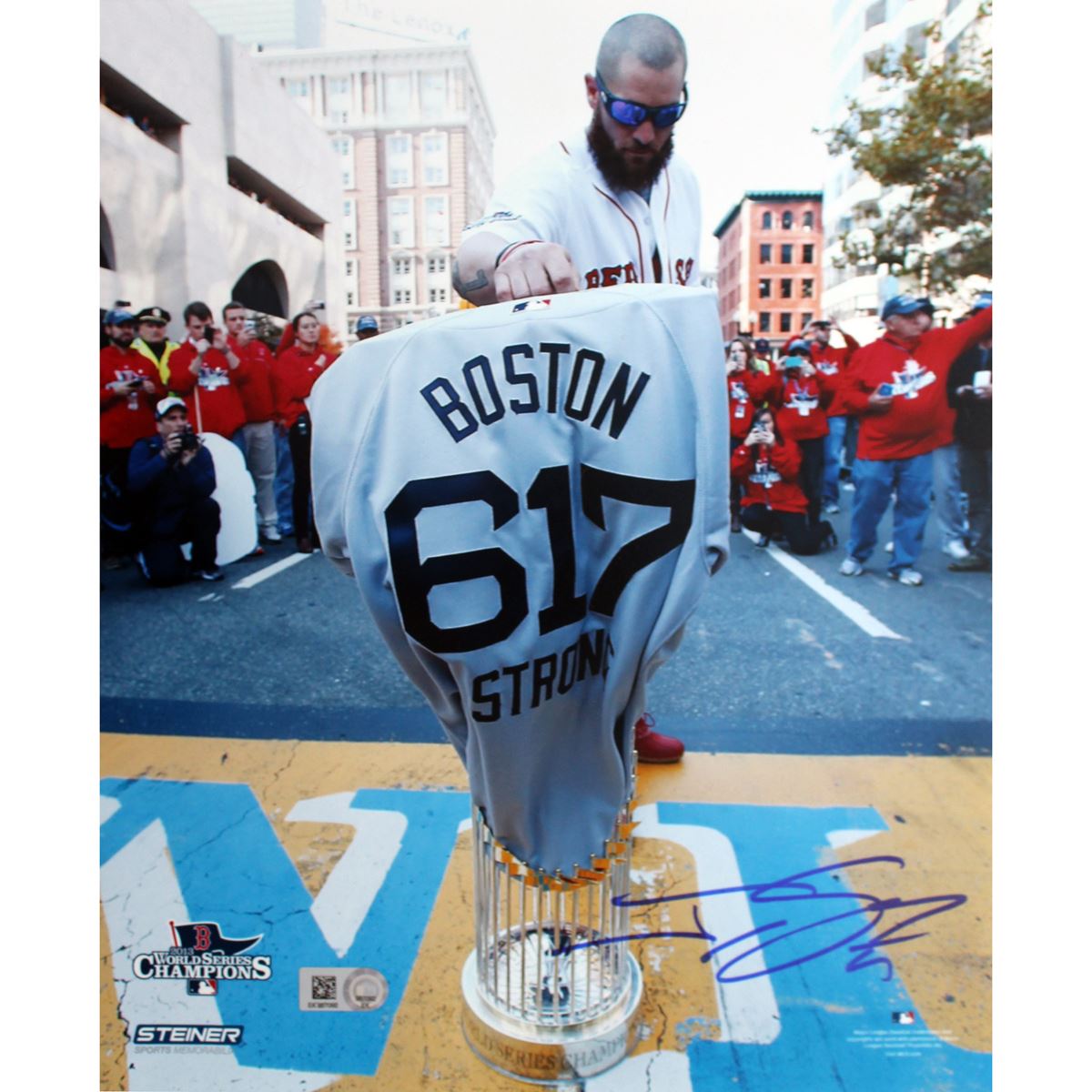 Jonny Gomes Signed World Series Tropy at Finish Line w/ Boston Strong Jersey 8x10 Photo (MLB Auth Only)