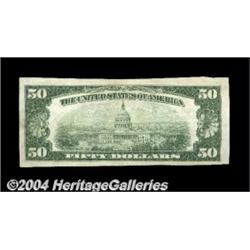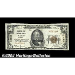 Joplin, MO - $50 1929 Ty. 1 Conqueror First NB Ch. # 13162A nice Extremely Fine from one of the two banks to issue the $50 denomination from here, this having the smaller printing of the two, with only 316 sheets, this one coming fairly close to the end of the run. A problem free example of an increasingly elusive denomination. <BR><BR><B>Important notice:</B> Heritage usually auctions material at the rate of 200-250 lots per hour. On some occasions eBay Live bid software or the Internet may not be able to keep up with the pace of the auction. We recommend placing a realistic absentee bid now as insurance to avoid disappointment. Occasionally the auctioneer may eliminate or reject an eBay Live bid, and the auctioneer may also reopen a lot after the close of the eBay live bidding (usually because we missed an audience bid), and may reject your bid even if it shows you as the winning bidder. By bidding via eBay Live, you agree that Heritage may award the lot to another bidder at its sole discretion under the circumstances described above or any other reasonable circumstances. Since eBay bids are not shown to us until we open the lot on the floor, we treat those bids just like floor bids. In most cases the floor responds before the eBay bid is presented to us, due to Internet lag time, so for consistency we have made it a policy that floor bids are always considered first over tie eBay live bids. Also please note that all Heritage lots purchased through eBay Live carry a 20% Buyer's Premium. Please make sure you read the Terms and Conditions before you bid. <BR><BR><B>IMPORTANT ANNOUNCEMENT ABOUT RESERVES:</B> Heritage now divulges all reserves on its web site 7 days before every auction. If you want to know whether the reserve on this lot has been met, and if not, what the reserve amount is, please visit this lot page on the HeritageCoin.com web site, or email: bid@HeritageGalleries.com