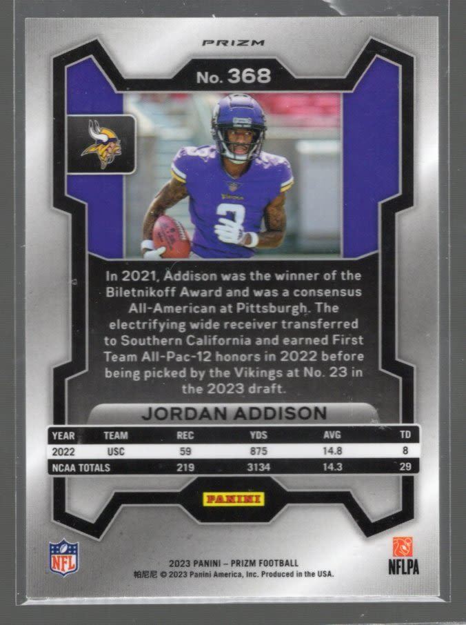Jordan Addison Silver Prizm Rookie Card 2023 Panini Prizm #368