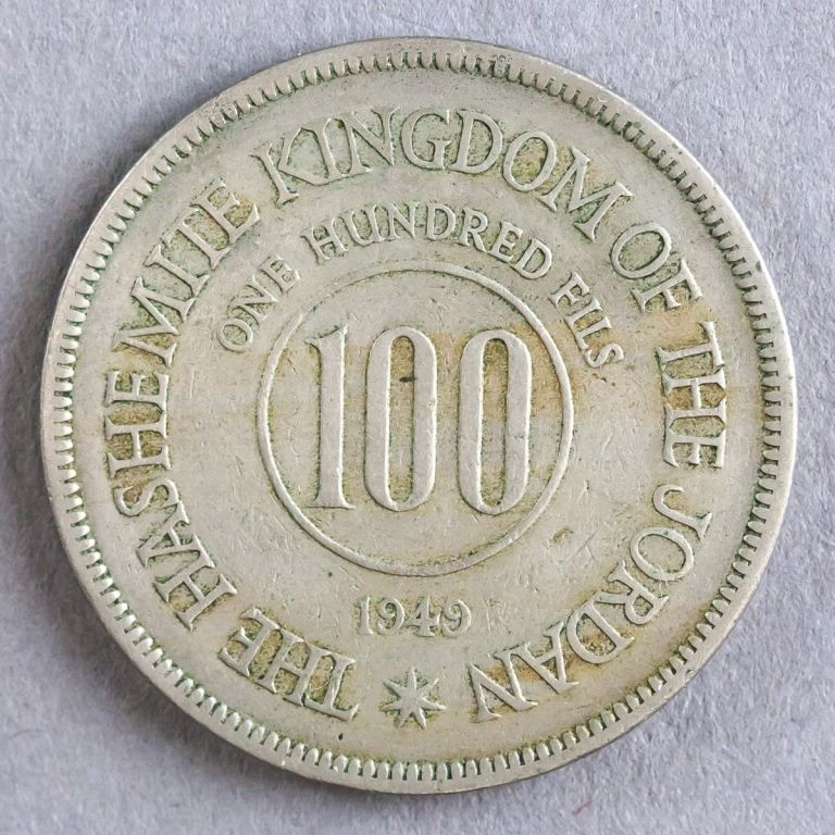 Jordan coin. Obverse: Value and date within crowned circle within sprigs. Lettering in Arabic. Reverse: Value within circle above date and star. Lettering: THE HASHEMITE KINGDOM OF THE JORDAN / ONE HUNDRED FILS / 100 / 1949.