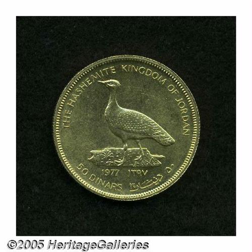 <B>King Hussein gold 50 Dinars 1977, </B></I>KM34, brilliant UNC, minor handling on the reverse and a gouge on the bust just below the mouth. Rare type with only 829 business strikes minted. The reverse depicts the Houbara Bustard (bird!)