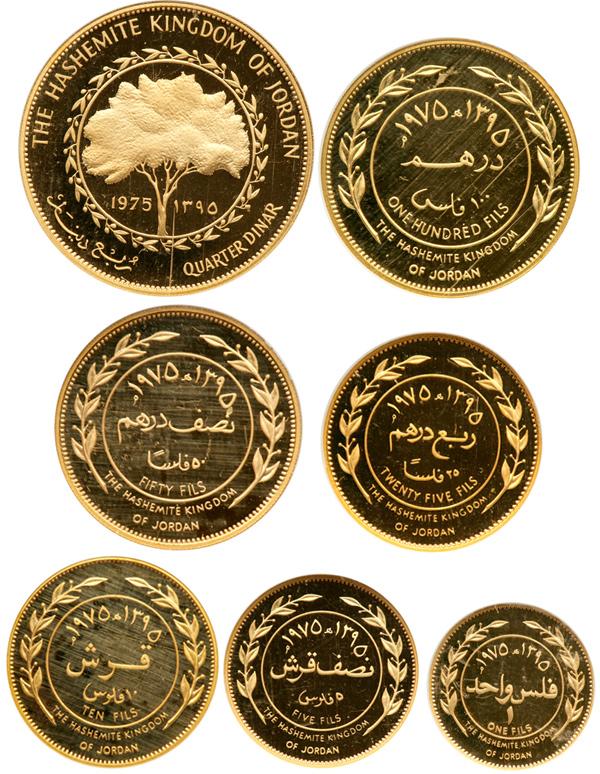 Jordan. Pattern 7 Piece Proof Set: 1, 5, 10, 50 Fils ¼ and 1 Dinars Gold Strikings, 1975. KM-PN7 - PN13. Reported mintage of only 2 Sets. Bust of Hussein Ibn Talal right. Very Rare set. PCI graded All seven coins, Proof 68.