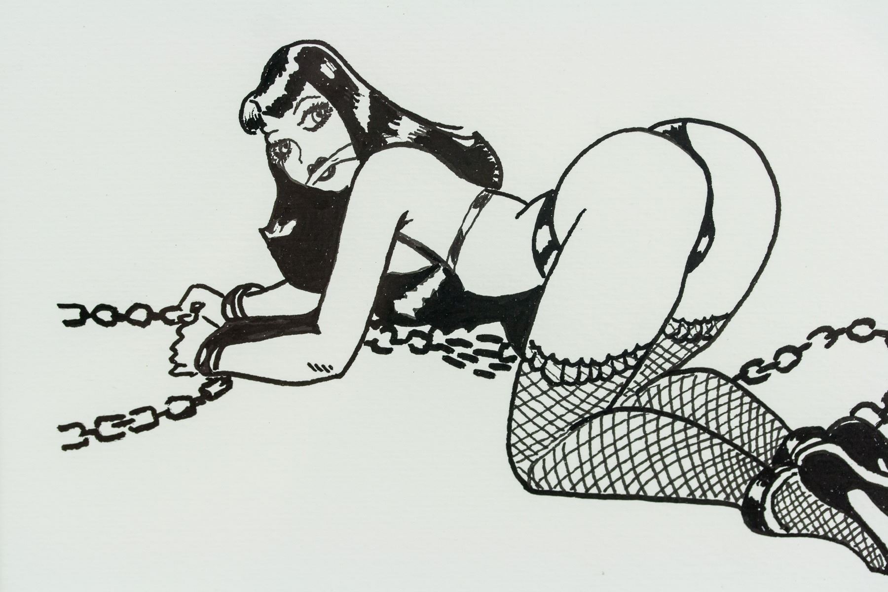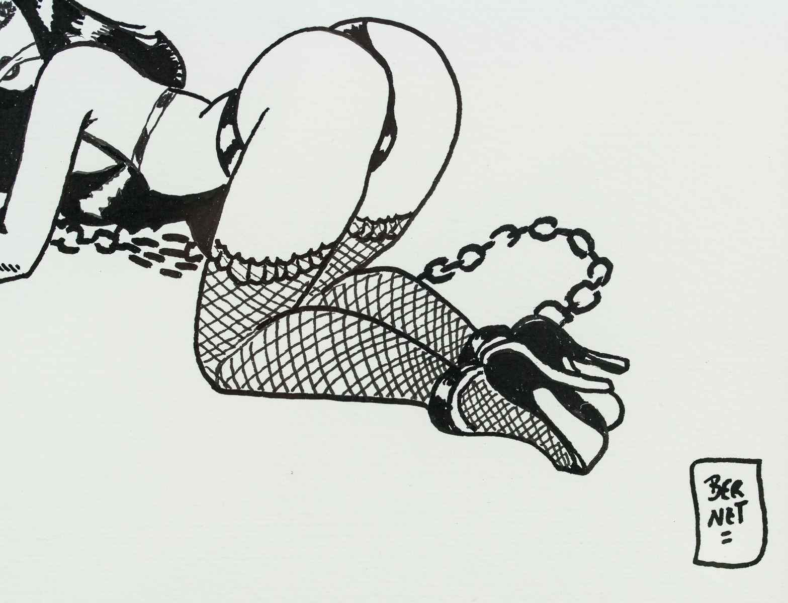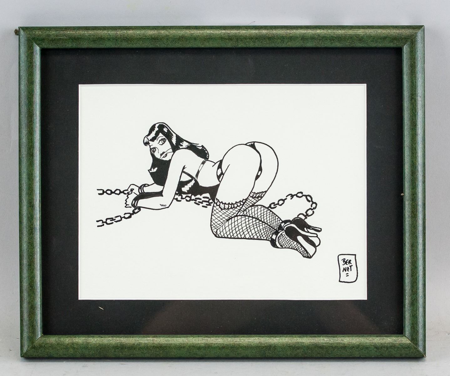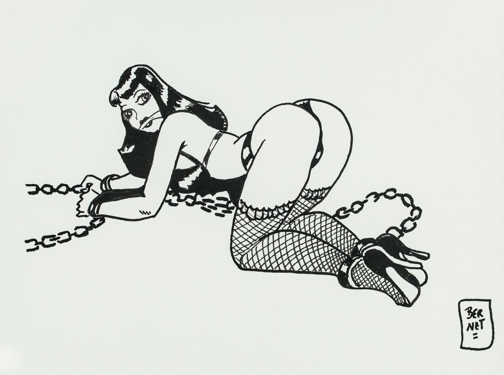 Ink on paper, framed. Featuring a sketch of a woman in bondage. Signed BERNET on the lower right corner. Attributed to Jordi Bernet (Spanish, born 1944). 14 x 16.5 cm (5.5 x 6.5 inches). Frame size: 22 x 27.5 cm (8.7 x 10.8 inches). PROVENANCE: Southern Ontario estate