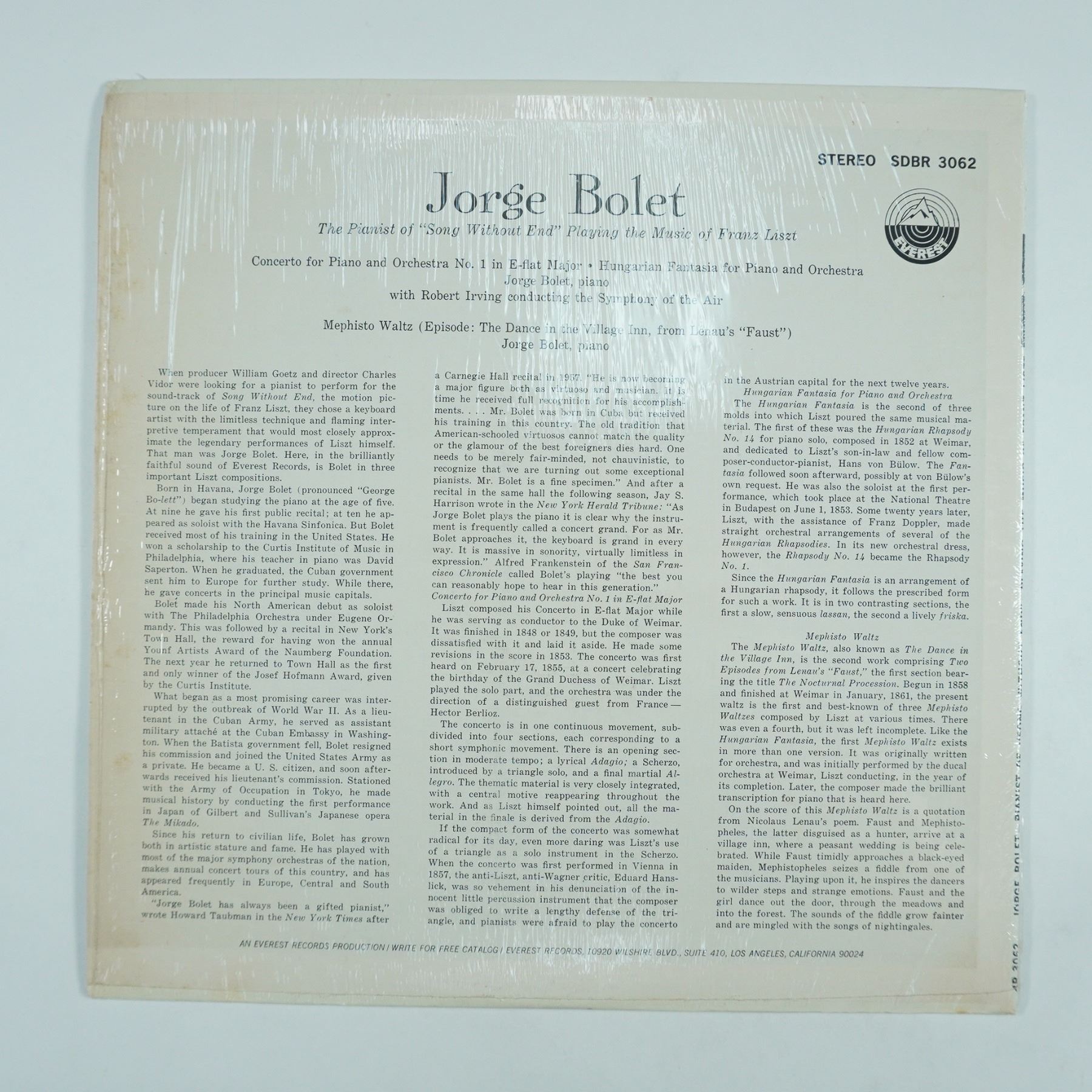 Original stereo pressing of Song Without End: The Music of Franz Liszt, featuring pianist Jorge Bolet, released on Everest Records (catalog number SDBR 3062). This album includes performances of Liszt's most famous works, recorded in connection with the 1960 film Song Without End (The Franz Liszt Story), in which Bolet provided the on-screen piano performances. The album features: Piano Concerto No. 1 in E-flat Major, Mephisto Waltz (Episode: The Dance in the Village Inn from Gounod's Faust). Jorge Bolet (1914-1990) was a Cuban-American pianist widely recognized for his unparalleled mastery of Liszt's music. His commanding technique and expressive phrasing made him one of the most celebrated interpreters of Romantic piano repertoire.