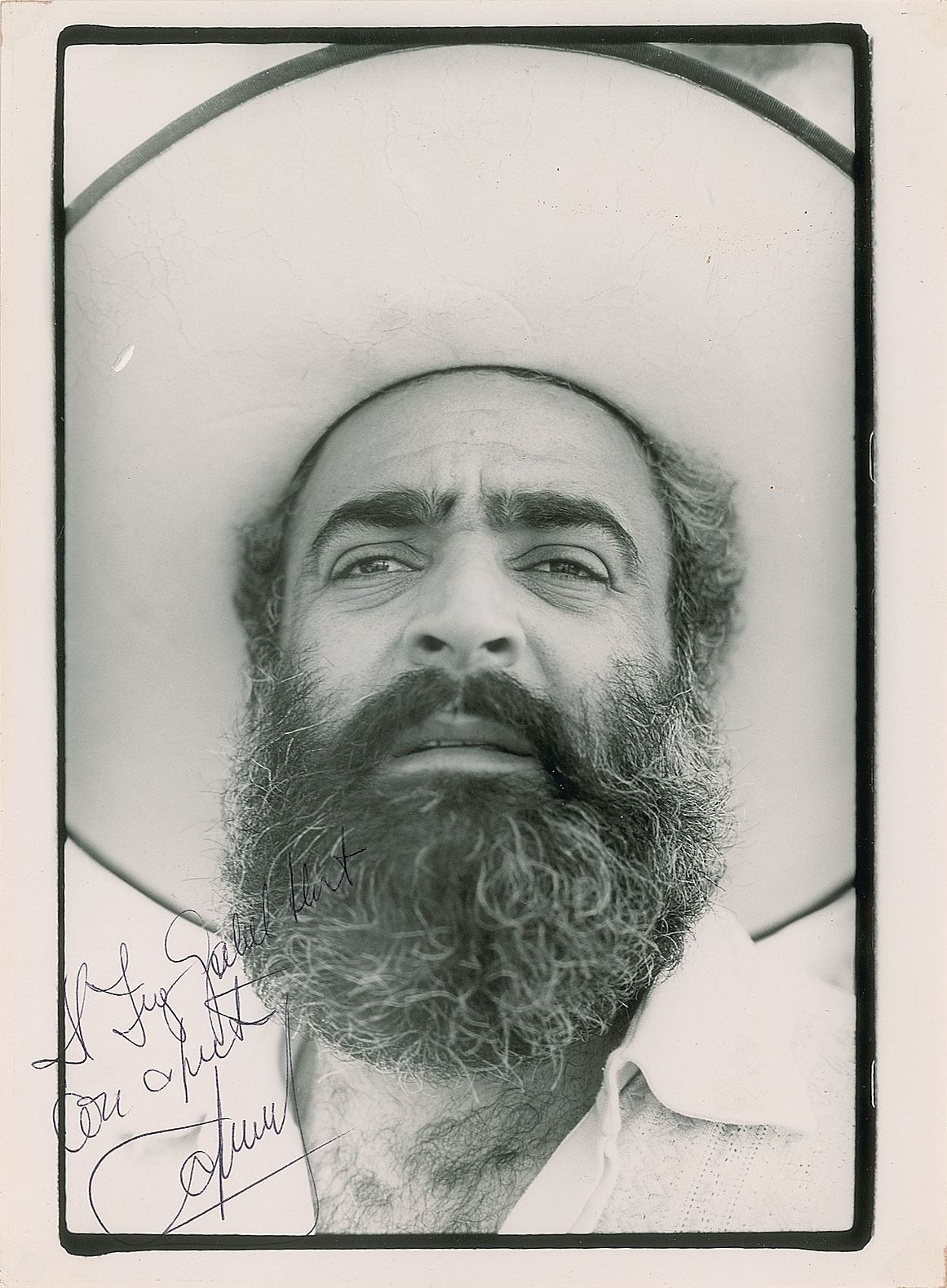 Glossy 7 x 9.5 close-up photo of Cafrune in a large hat, signed and inscribed in black ballpoint. Reverse bears a Tom Dalval credit stamp. In very good to fine condition, with a diagonal crease, and associated fleck of emulsion loss, to the upper left.