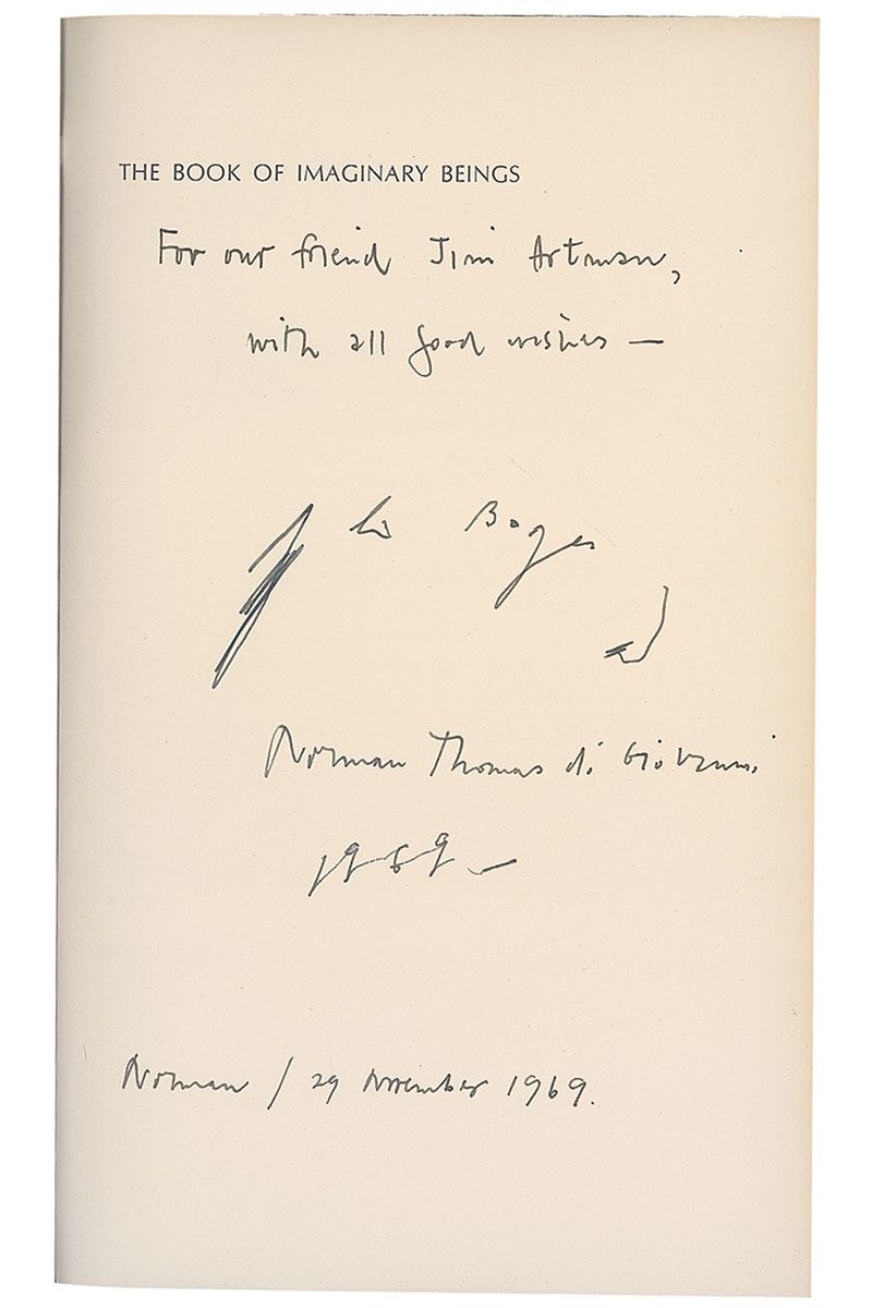 Signed book: The Book of Imaginary Beings. First edition. NY: E. P. Dutton, 1969. Hardcover with dust jacket, 6 x 9.5, 256 pages. Signed on the half-title page in black ink by Borges and also signed and inscribed by the book’s translator Norman Thomas di Giovanni. In fine condition, with a couple of small labels affixed to the front flap of the clipped dust jacket.
