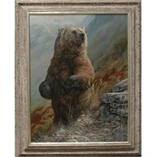 Original acrylic on canvas of grizzly bear in the wild. Artist: Jorge Mayol, done in 2000, signed lower right. Heavy rough wood frame. Frame measures 42" x 52", canvas measures 32" x 42". Excellent condition.