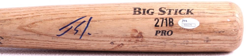 Adirondack Pro Big Stick Baseball Bat. Hand-signed in blue felt-tip pen by Jorge Soler (Cubs). The bat has been game-used and cracked by an unknown player. The autograph includes an official James Spence Authentication (JSA) hologram and matching COA for authenticity purposes.