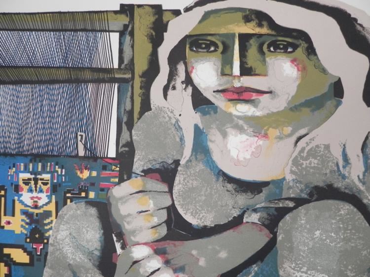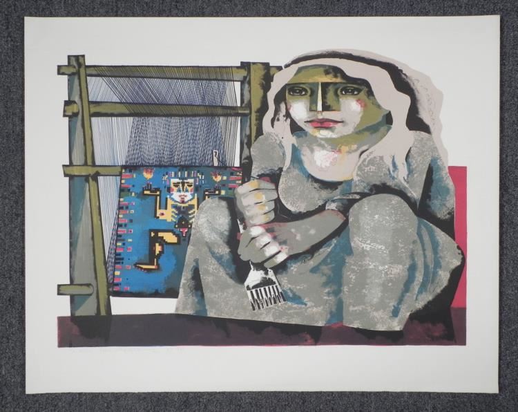 This interesting portrait shows a woman standing next to a weaving machine wherein she has produced a traditional woven blanket. Artist: Jorges Dumas Signature: "Jorges Dumas" in pencil, lower left Medium: Lithograph on rag paper Edition: Unnumbered, dedicated artist proof, marked "To Michel from Jorges Dumas N.Y. 1975," in pencil, lower left Date: 1975 Publisher: Circle Gallery -blind stamp, lower left Sheet size: 24 x 30 inches Condition: Excellent Biography:Jorge Dumas, (1928-1985) was born in Montevideo, Uruguay. When he was 16, Dumas began to study drawing at the "Taller Torres Garcia." In the same year, he also had his first exhibition in Sao Paolo, Brazil. Over the course of his career, Dumas worked as a set designer, an illustrator for the newspaper "El Labroso," and a drawing instructor. In the 1960s, Dumas collaborated on a mural at the Pan American Union building in Washington, D.C. In the 1970s, he began having his first solo exhibitions across North and South America.