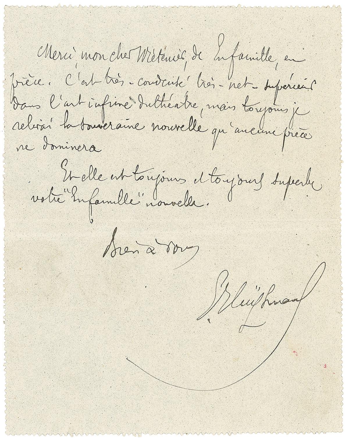 French novelist most famous for the novel À rebours (Against the Grain or Against Nature). ALS in French, signed “J. K. Huysmans,” one page, 4.5 x 5.5, no date, but postmarked June 20, 1887. Untranslated letter to writer Oscar Métenier about his theater piece En famille. In fine condition, with an extra horizontal crease and a bit of scattered light soiling.