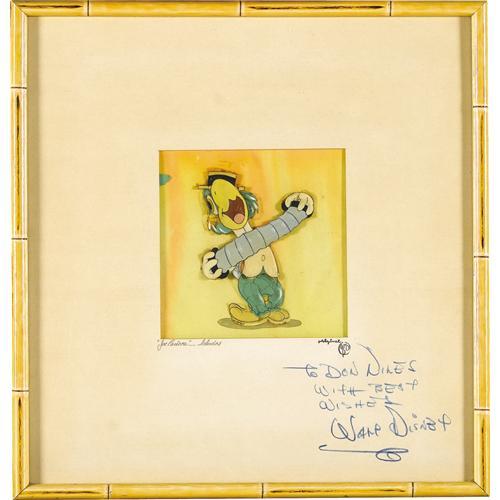 <B>Jose Carioca "Saludos" Animation Production Cel with Courvoisier Background, Signed by Walt Disney (Walt Disney, 1942).</B></I> Disney's South-of-the-Border star plays a little tune for his fans in this animated cel, matted and framed to an overall size of 14" x 14.75". While the trimmed Jose cel (approximate size: 4" x 5") has seen better days, with considerable paint loss (some of which has become affixed to the background), what really stands out here is the bold inscription, done in blue pencil, from Walt Disney himself. This was a present from Walt to an employee, who was leaving due to health concerns. It's a great signature, one that should please any autograph collector.<BR><BR><b>Shipping:</b> Framed - with Glass, Small (<a target="_blank" href="http://www.heritageauctions.com/common/shipping.php">view shipping information</a>)