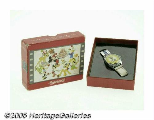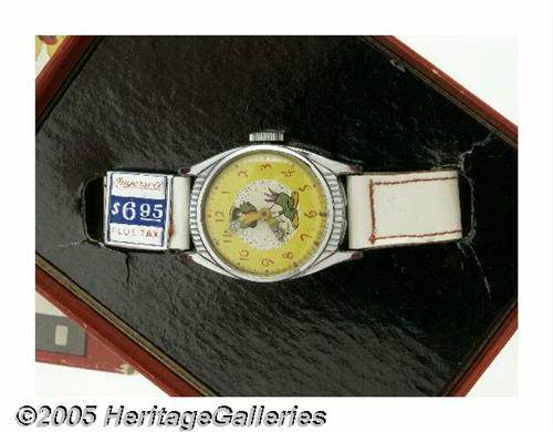 <B>Jose Carioca Wrist Watch in Box (Ingersoll, 1953).</B></I> In 1941, while the Disney Studios were on strike, Walt Disney and a large entourage of his employees took a lengthy tour of South America to spread good will among our global neighbors, and to gather material for future animated projects. From this tour came two feature films, "Saludos Amigos" and "The Three Caballeros," and a new star -- Jose Carioca. This Ingersoll wrist watch features a snappy picture of Jose Carioca front and center. The watch face bears a bit of spotting, but the colors are bright and the image is clear. The band is in Excellent condition, and includes the original price tag. The box has a bit of shelf wear, but remains in great shape. <I>From the Larry Jacobs Collection.</B></I>