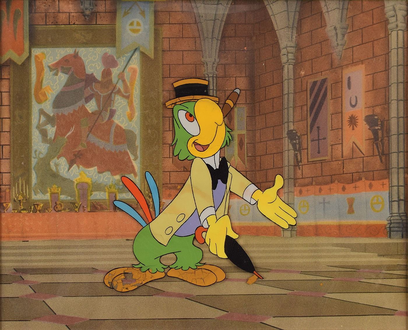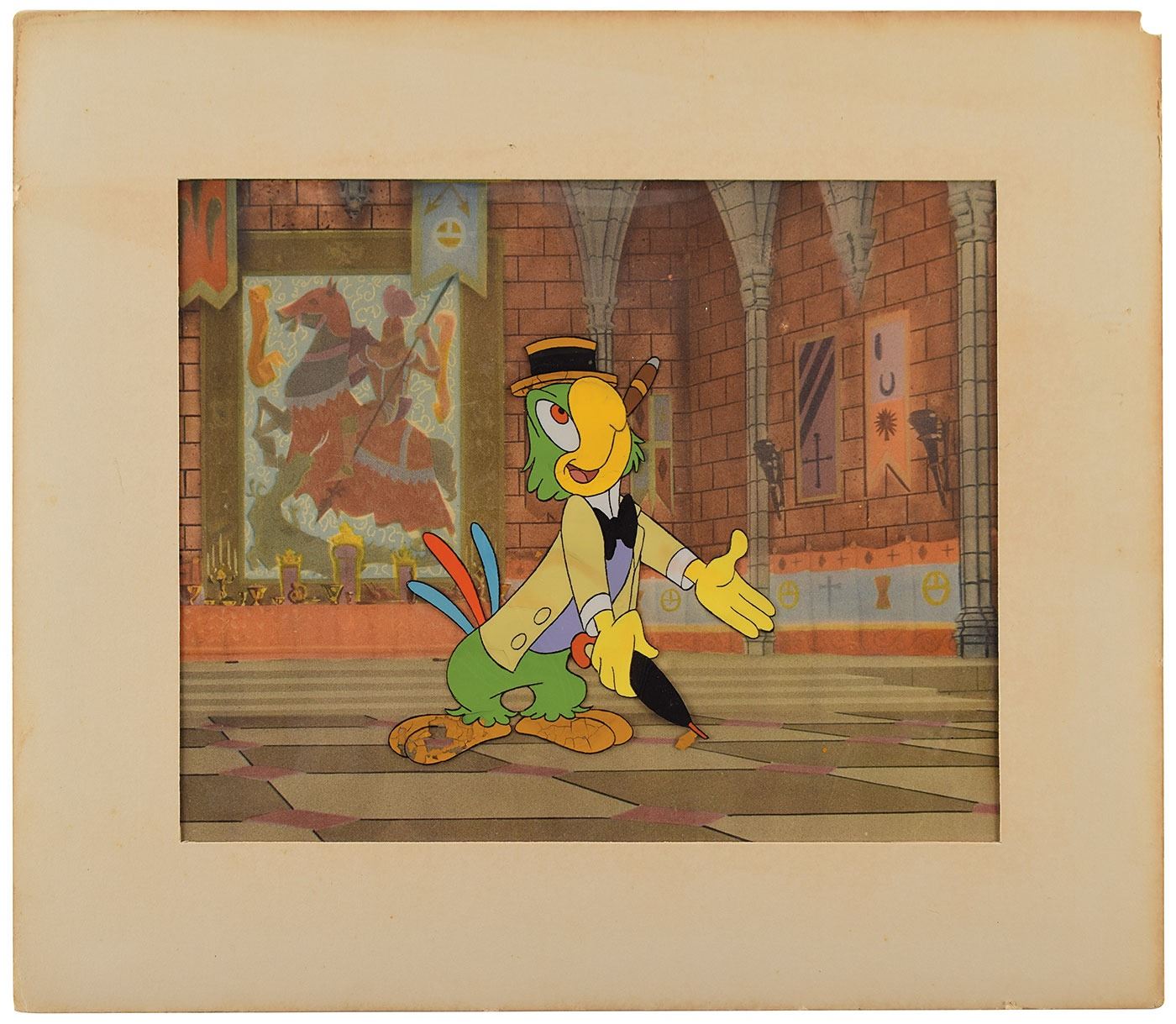(Walt Disney Studios, 1960s) Original production cel featuring Jose Carioca of Three Caballeros fame from a 1960s Disney TV show, showing the cigar-chomping parrot with umbrella in an enthusiastic full-length pose. The cel is placed on a color copy background. Image measures 4.5 x 5, with a mat opening of 9.75 x 8. Mat dimensions are 14 x 12. Reverse of backing bears an affixed gold Walt Disney Productions label, which reads: "This Is an Original Handpainted Celluloid Drawing Actually Used in a Walt Disney Production." In very good condition, with crackling to paint, most notably to feet where some paint is missing.