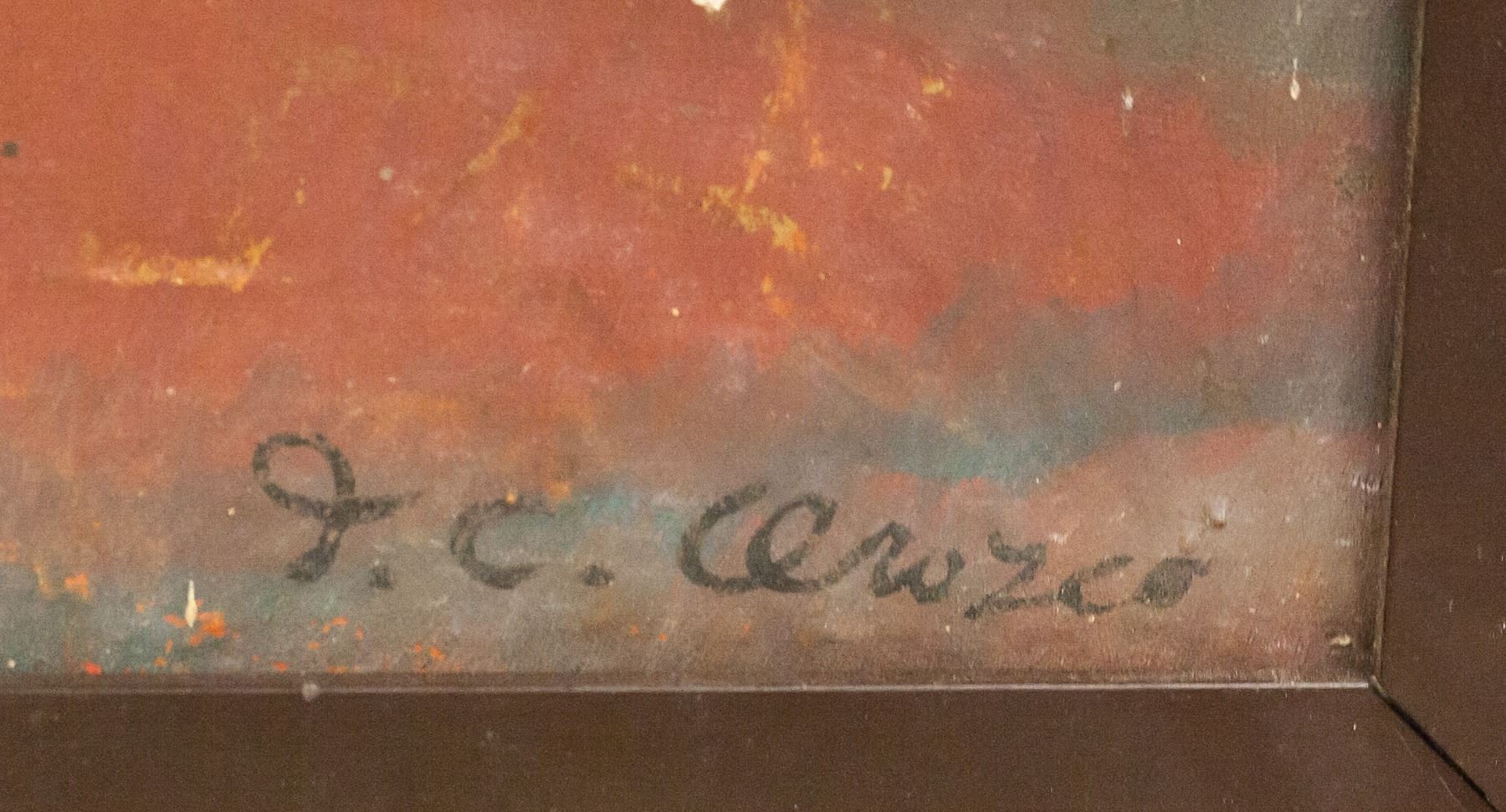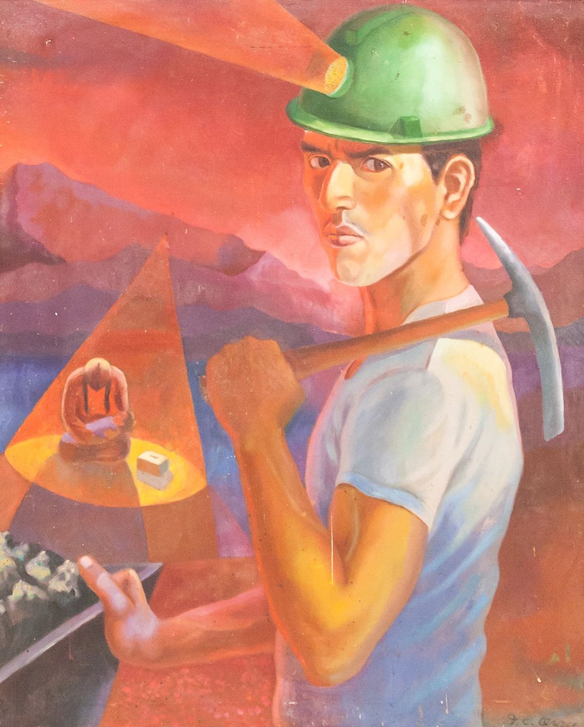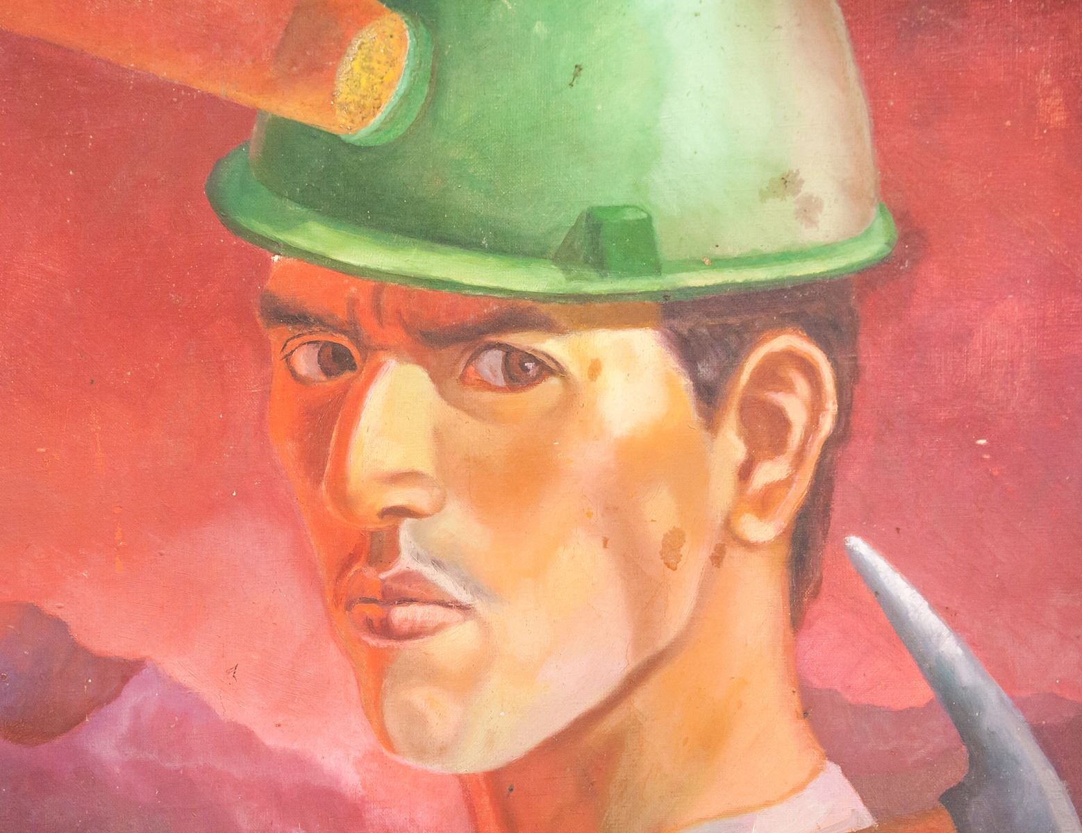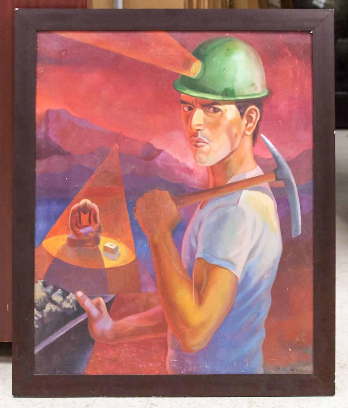 Oil on canvas, framed. Featuring a miner wearing a hardhat and carrying a pickaxe. Signed "J. C. Orozco" in the bottom right corner. Attributed to Jose Clemente Orozco (1883-1949, Mexican). 81 x 66 cm (32 x 66 in), Frame: 90 x 75 cm (35.5 x 29.5 in). Provenance: This lot carries limited provenance from a Southern Ontario estate.