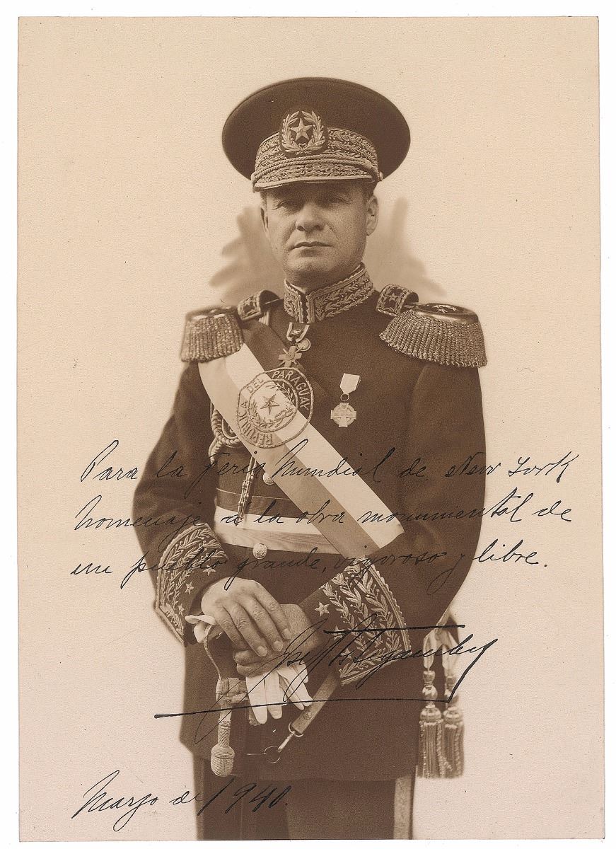Paraguayan war hero and President of Paraguay for the Liberal party (1888–1940). Vintage matte-finish 6.5 x 9 three-quarter length photo of Estigarriba in his military uniform, signed and inscribed in black ink in Spanish, “Jose F. Estigarriba,” adding the date below, “Marzo de 1940.” Blindstamped in the lower right corner by the photographer. In fine condition, with moderate contrast to the signature against his dark suit and trivial soiling.