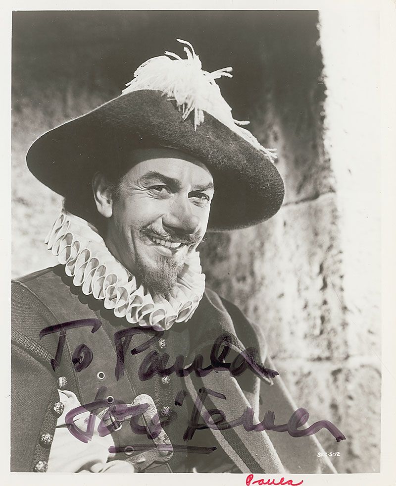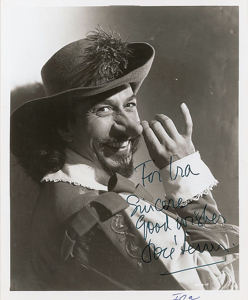 Two glossy 8 x 10 photos of Ferrer in his Academy Award-winning role as Cyrano de Bergerac, each signed and inscribed in black felt tip. In fine condition, with small notations to bottom border of each photo, and a few edge and corner creases. Originate from the collection of the legendary Movie Star News, run by the Klaw family.