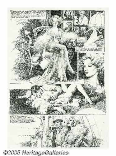 <B>Jose Gonzalez - European Erotic Comic Page Original Art (undated).</B></I> Drawing from Golden Age Hollywood references, this striking page was created in soft tones of graphite by Jose Gonzalez for a Spanish publication. Deftly handled pencil strokes, combined with smooth, almost photographic tones, bring a refined polish to this elegant illustration. The image area measures 16" x 23". The word and type balloons are on separate pieces affixed to the original art; otherwise the art is in Excellent condition.