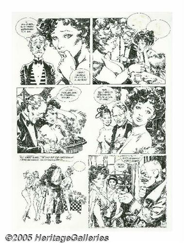 <B>Jose Gonzalez - European Erotic Comic Page Original Art (undated).</B></I> The popular Miss Chantal is the focus of everyone's attention in this slinky, seductive page by Vampi-vet, Jose Gonzalez. With its textural inking, high polish, and fidelity to photo reference, this strip is a masterful example of the "Spanish School," which spearheaded the later period of the Warren horror era. The image area measures approximately 14.5" x 20.5". The art has some scattered staining from some missing word balloon paste-ups, but is in otherwise Very Good condition.