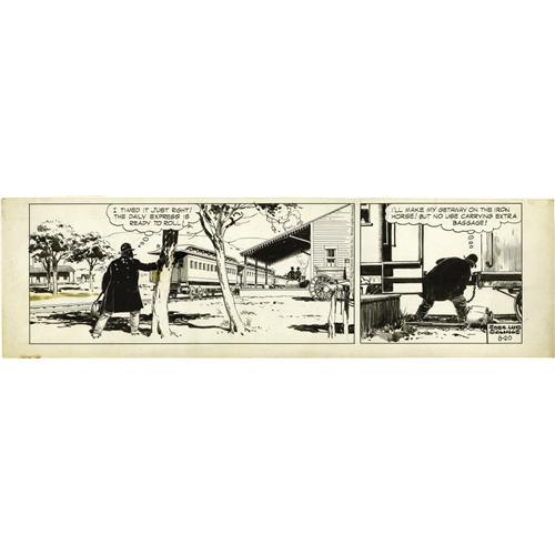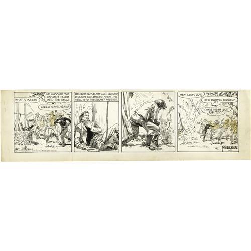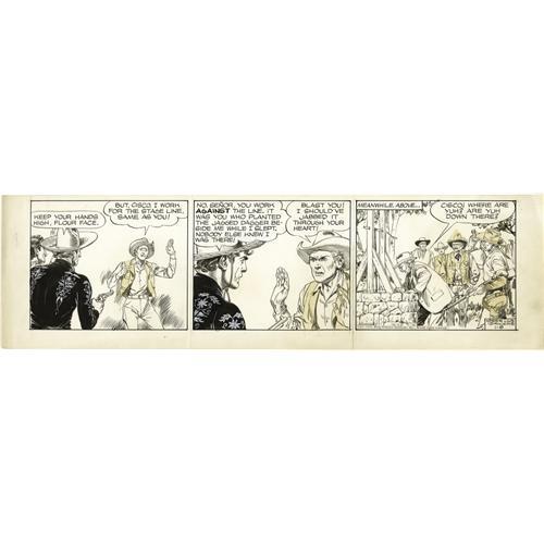 <B>Jose Luis Salinas - Cisco Kid Daily Comic Strip Original Art, Group of 4 (King Features Syndicate, 1952-57).</B></I> Jose Luis Salinas got his start in the advertising field in 1929, drawing for some of Argentina's largest agencies. In 1949, he moved to the United States, and joined King Features, where he illustrated the comic adaptation of O'Henry's <I>Cisco Kid</B></I> (written by Rod Reed) from 1951 to 1968. Here are four handsome dailies by Salinas, dated 1-8-52, 1-11-52, 1-14-52, and 8-20-57. The approximate image area of each strip is 20" x 5.25", and aside from some yellowing to the Zipatone, and a fold down one of the panel gutters of each daily, the strips average Very Good condition. <BR><BR><B>Important notice:</B> Heritage usually auctions material at the rate of 200-250 lots per hour. On some occasions eBay Live bid software or the Internet may not be able to keep up with the pace of the auction. We recommend placing a realistic absentee bid now as insurance to avoid disappointment. Occasionally the auctioneer may eliminate or reject an eBay Live bid, and the auctioneer may also reopen a lot after the close of the eBay live bidding (usually because we missed an audience bid), and may reject your bid even if it shows you as the winning bidder. By bidding via eBay Live, you agree that Heritage may award the lot to another bidder at its sole discretion under the circumstances described above or any other reasonable circumstances. Since eBay bids are not shown to us until we open the lot on the floor, we treat those bids just like floor bids. In most cases the floor responds before the eBay bid is presented to us, due to Internet lag time, so for consistency we have made it a policy that floor bids are always considered first over tie eBay live bids. Also please note that all Heritage lots purchased through eBay Live carry a 22.5% Buyer's Premium. Please make sure you read the Terms and Conditions before you bid. This lot is being auctioned in conjunction with a live floor auction by Heritage Auction Galleries. All final auction and invoice information will be supplied by Heritage Auction Galleries, and all other information should be considered preliminary. Lot:41001 <BR><BR><B>Winning Notification and Billing:</B> After the FINAL session in this auction is complete, Heritage will send e-mail and snail mail invoices. This process normally takes several days. All final auction and invoice information will be supplied by Heritage Auction Galleries, and all other information should be considered preliminary. <BR><BR>This auction will be conducted on a live auction floor and over the Internet through eBay Live. If you choose to place an absentee bid, please take a moment to <font color='#0000ff'><u><a href='http://pages.ebay.com/liveauctions/help/before/laabsentee.html'>learn how eBay Live absentee bidding works</a></u></font><font color='#000000'>