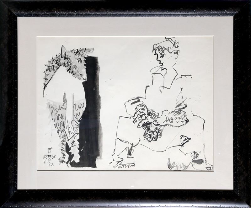 Jose Ortega, Seated Woman and Bull Figure, Ink and Watercolor
