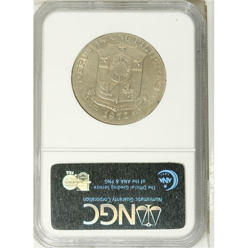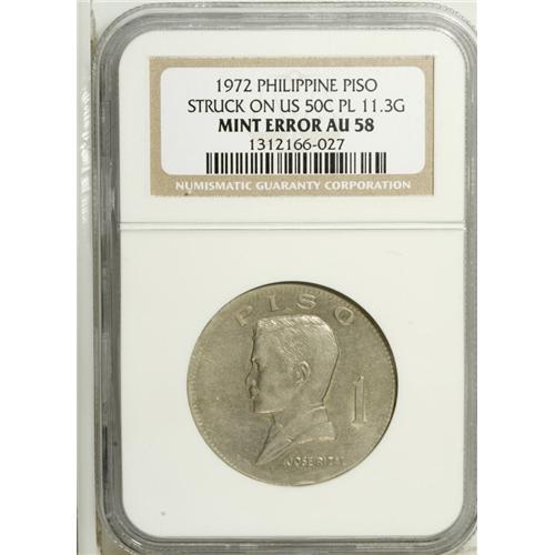 <B>Jose Rizal C-N Piso error 1972,</B></I> KM-203 for type, "Mint error struck on US 50c PL 11.3G" (on insert) AU58 NGC, original surfaces. Rare and interesting, should appeal to many collectors of this country (or of USA errors).<BR><BR><b>Shipping:</b> Coin/Currency (<a target="_blank" href="http://www.heritageauctions.com/common/shipping.php">view shipping information</a>)