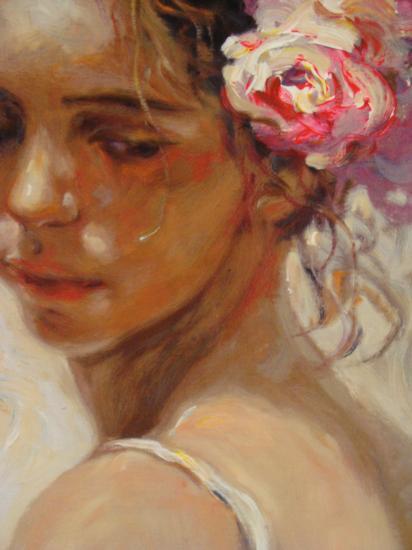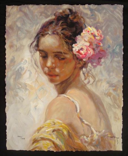 The print portrays a young woman with flowers in her hair. She is at once demure and sensuous, and representative of Royo's Romantic and Classical style.
