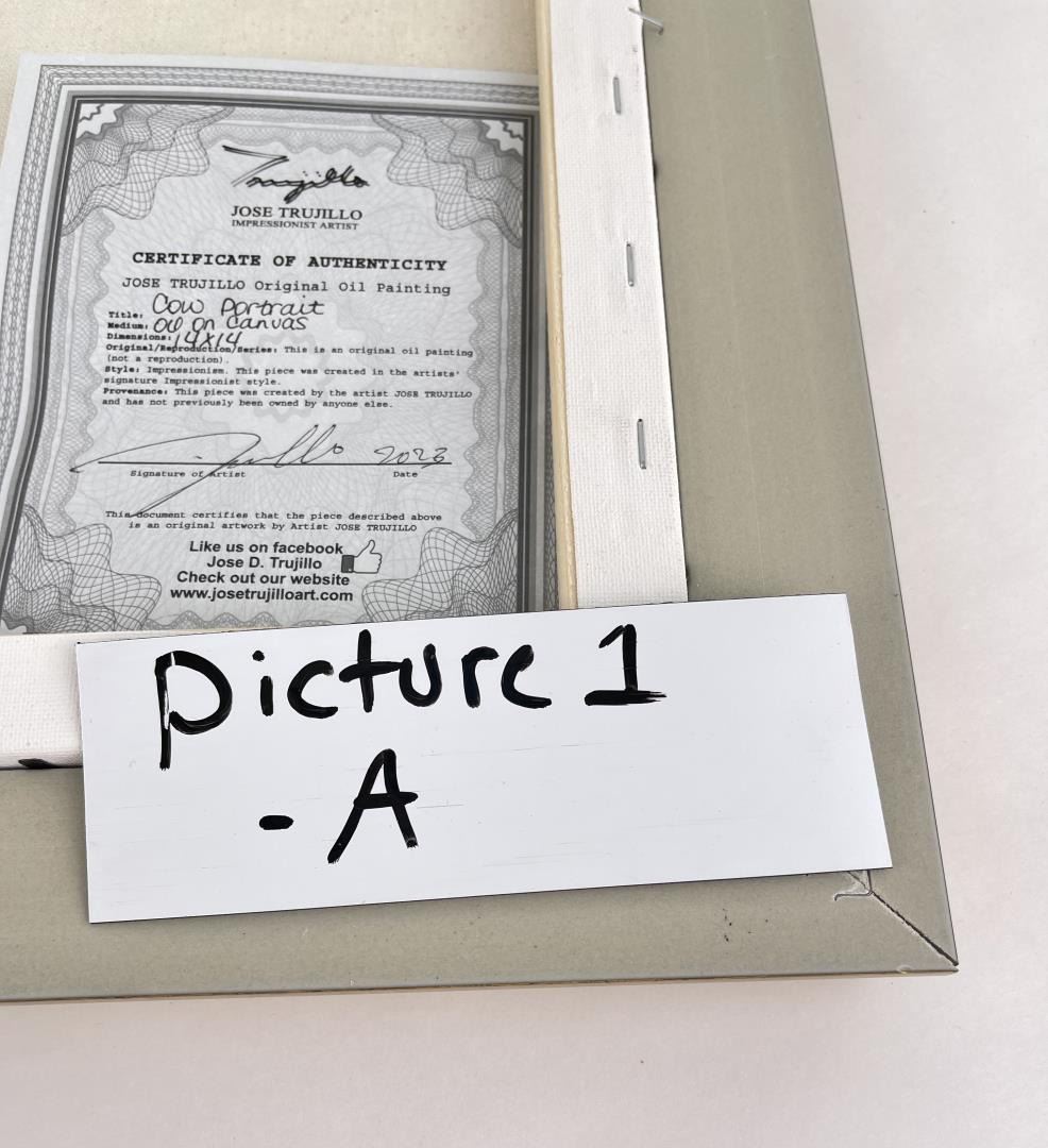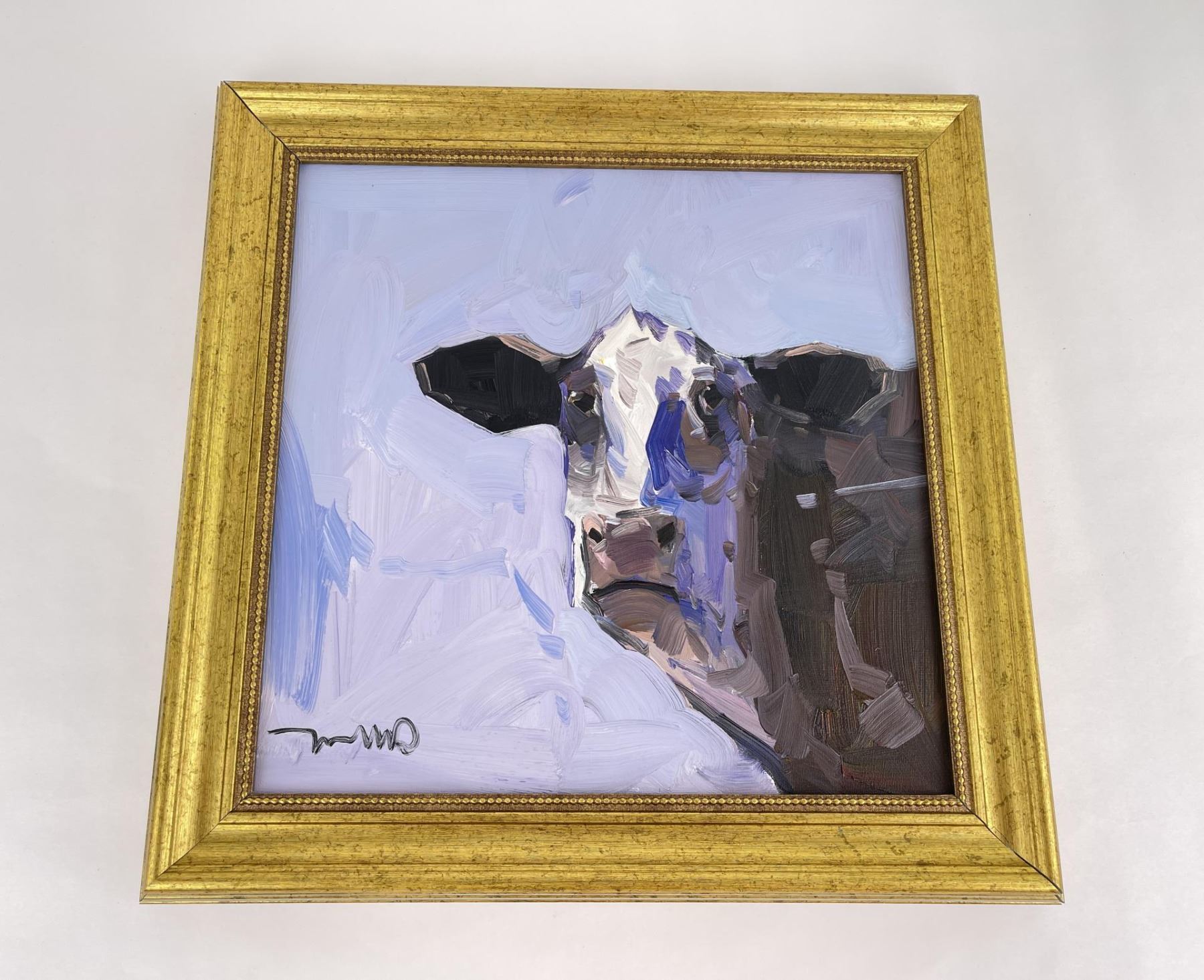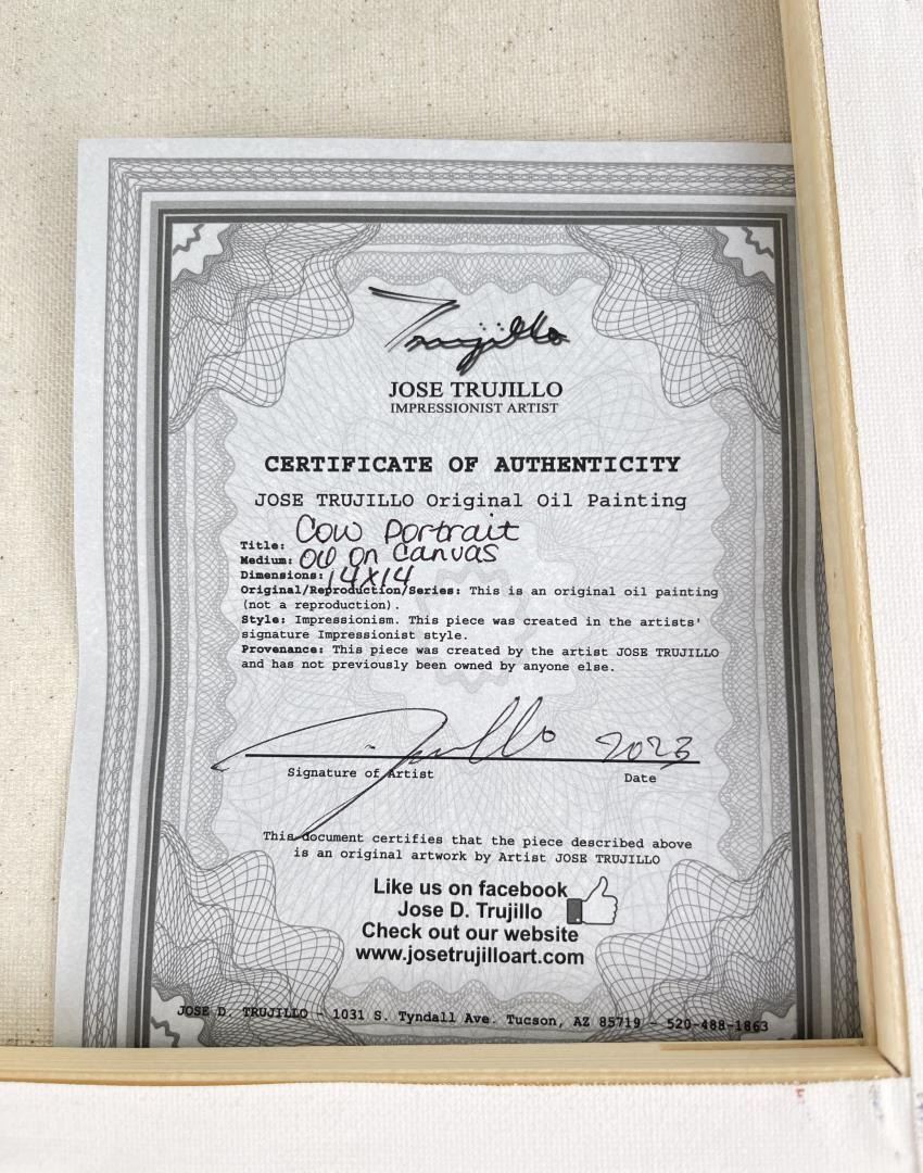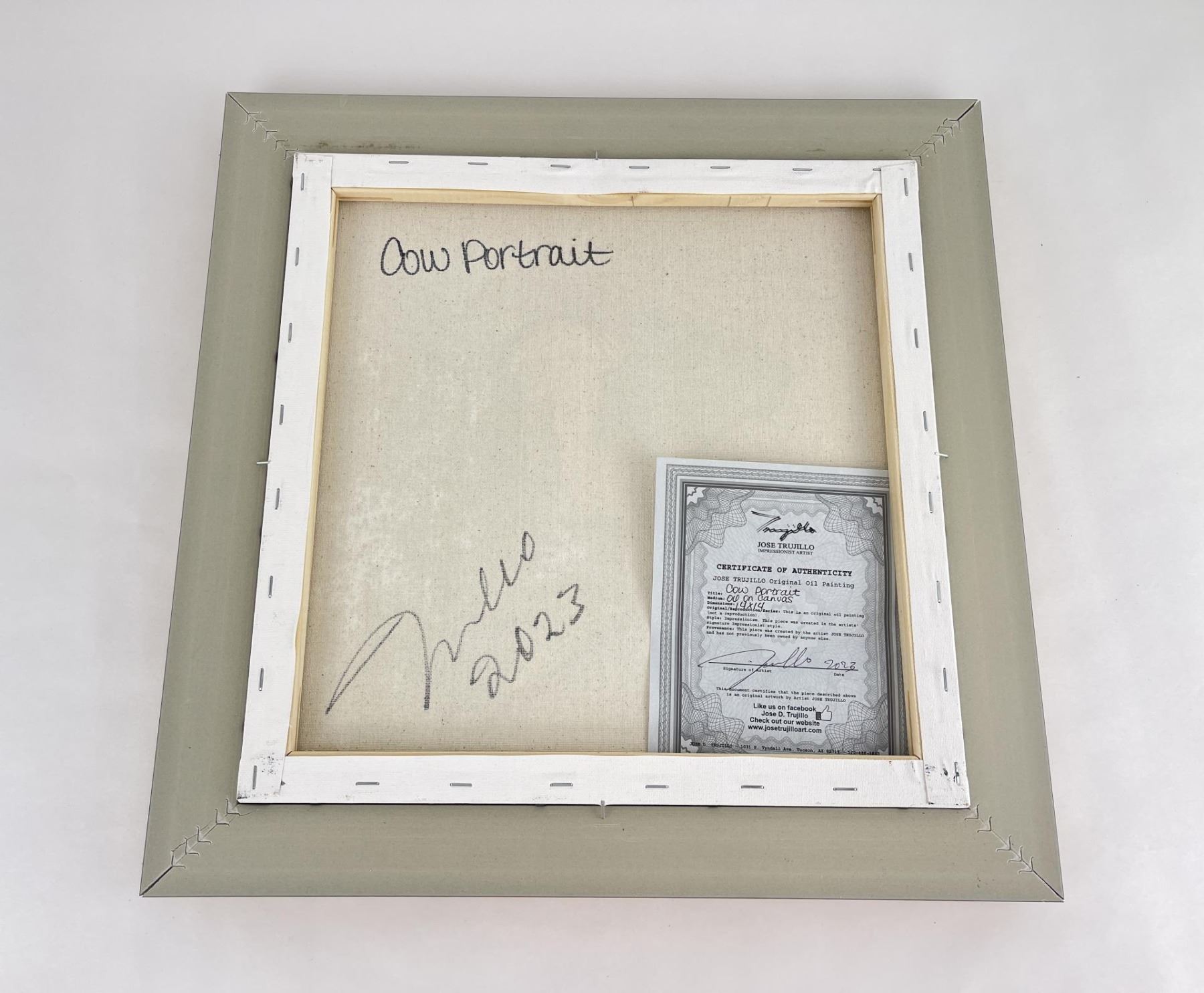 17 1/2" by 17 1/2" framed. Title is Cow Portrait. Jose Trujillo (1982-Present) Tucson Arizona.