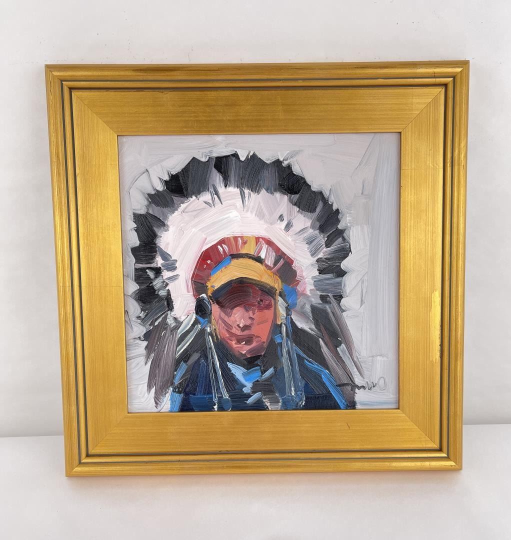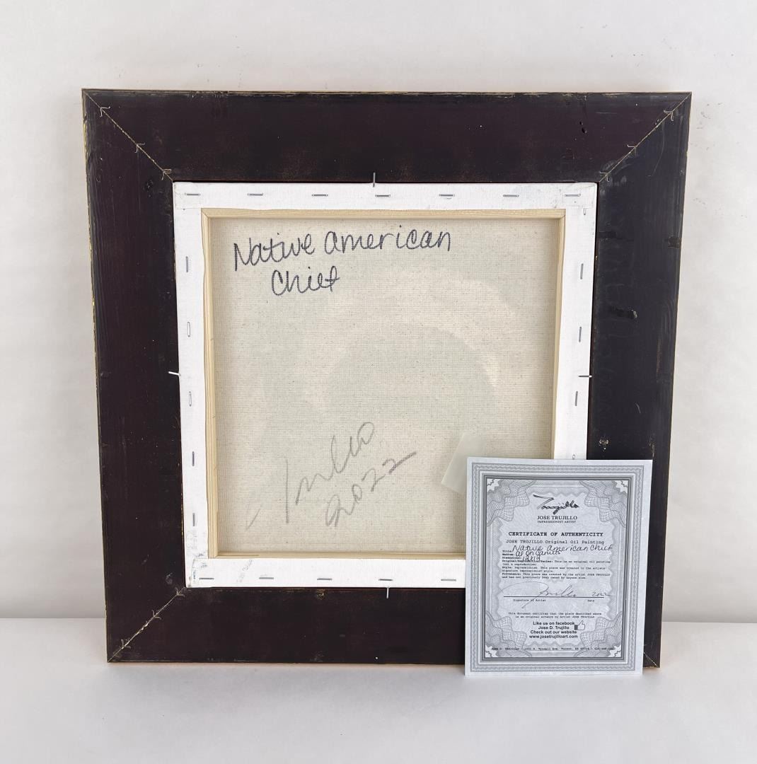 17" by 17" framed. Title is Native American Chief. Jose Trujillo (1982-Present) Tucson Arizona.