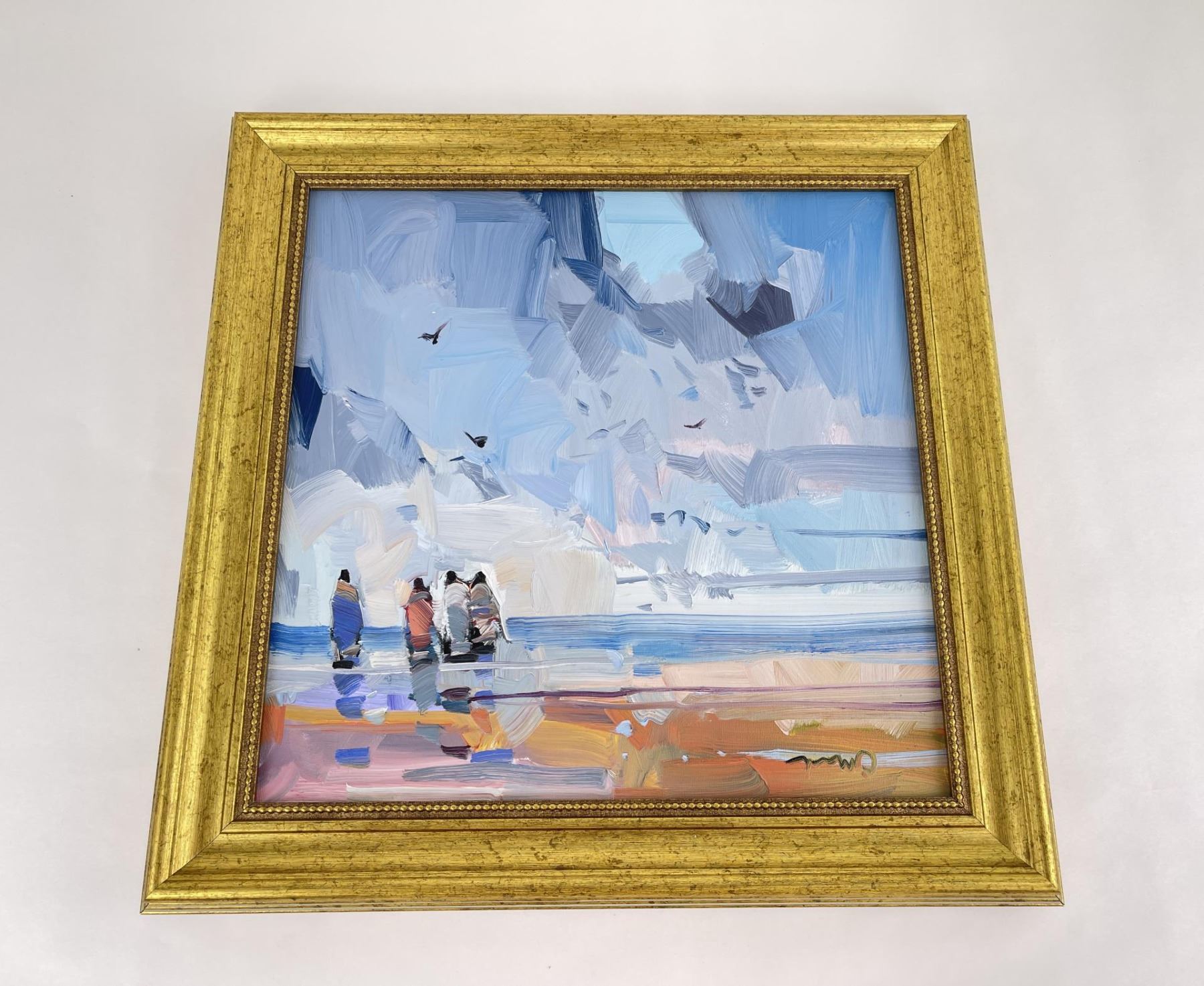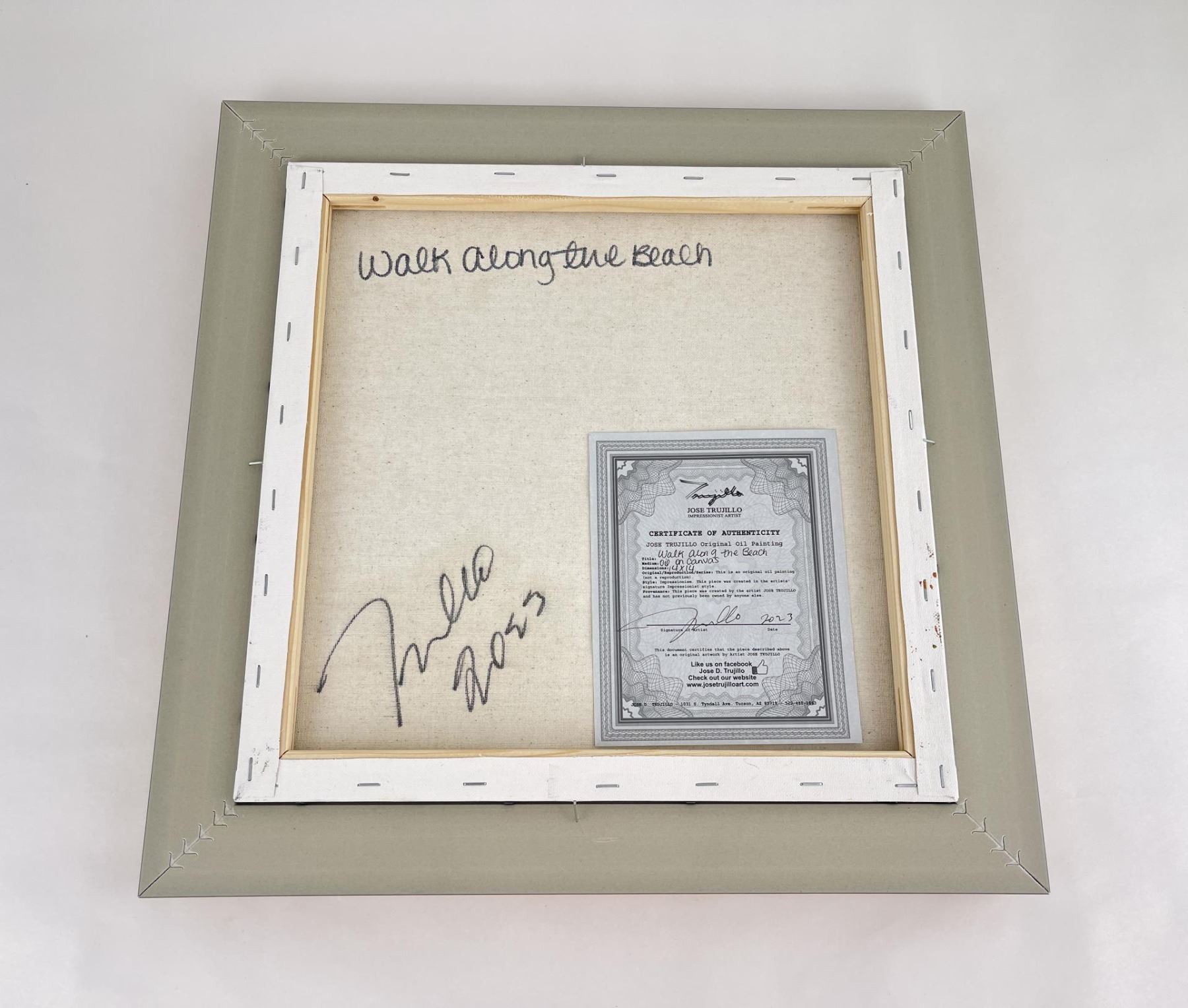 17 1/2" by 17 1/2" framed. Title is Walk Along the Beach. Jose Trujillo (1982-Present) Tucson Arizona.