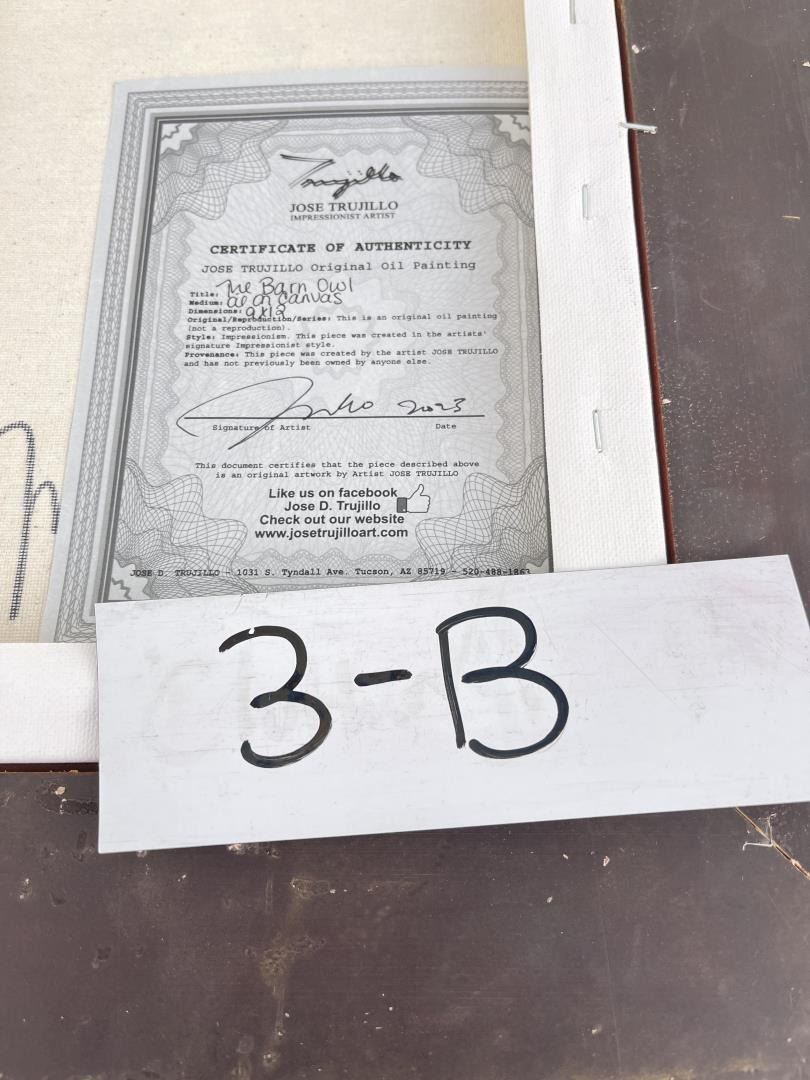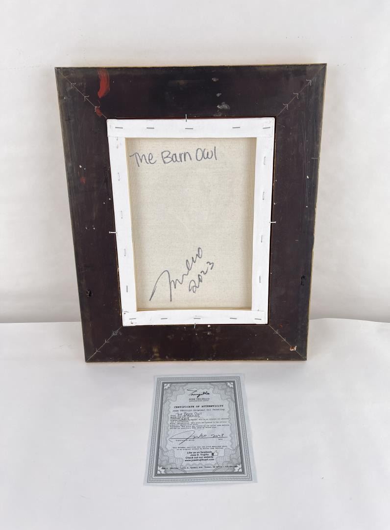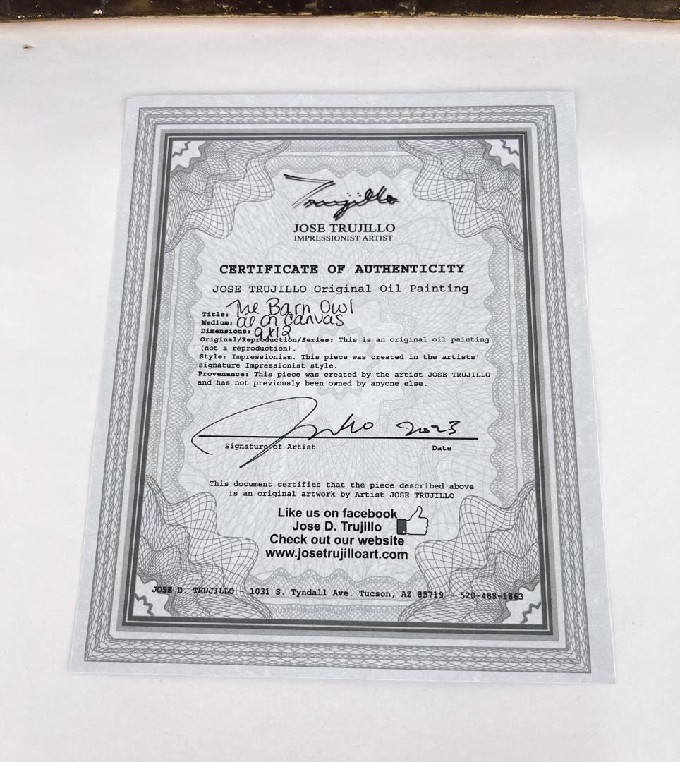 14" by 17" framed. Title is The Barn Owl. Jose Trujillo (1982-Present) Tucson Arizona.