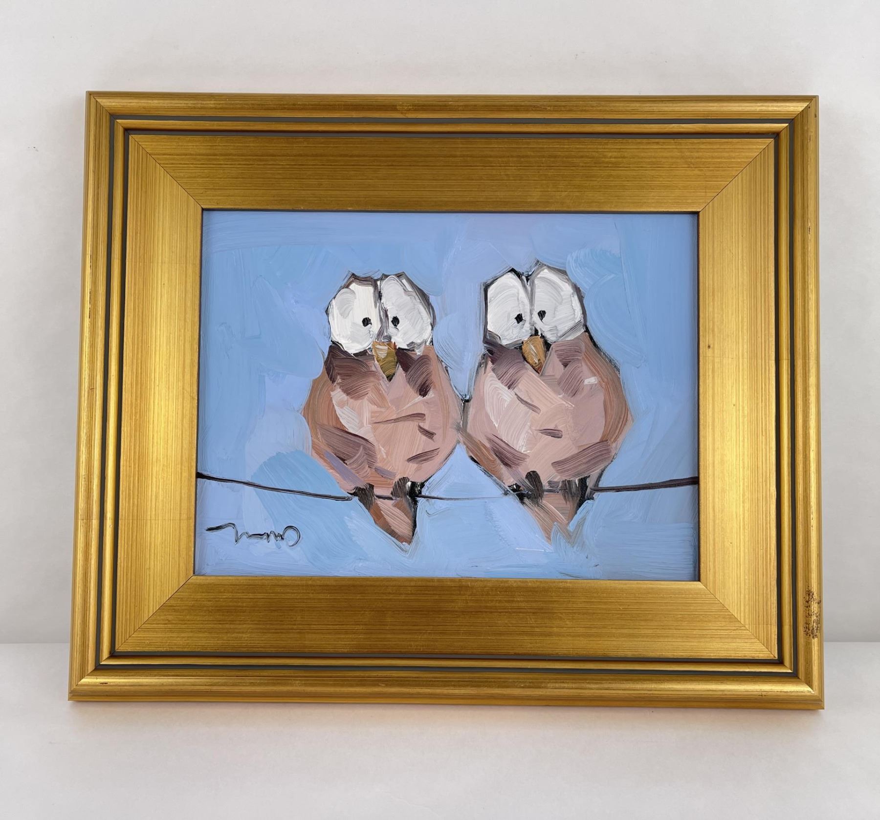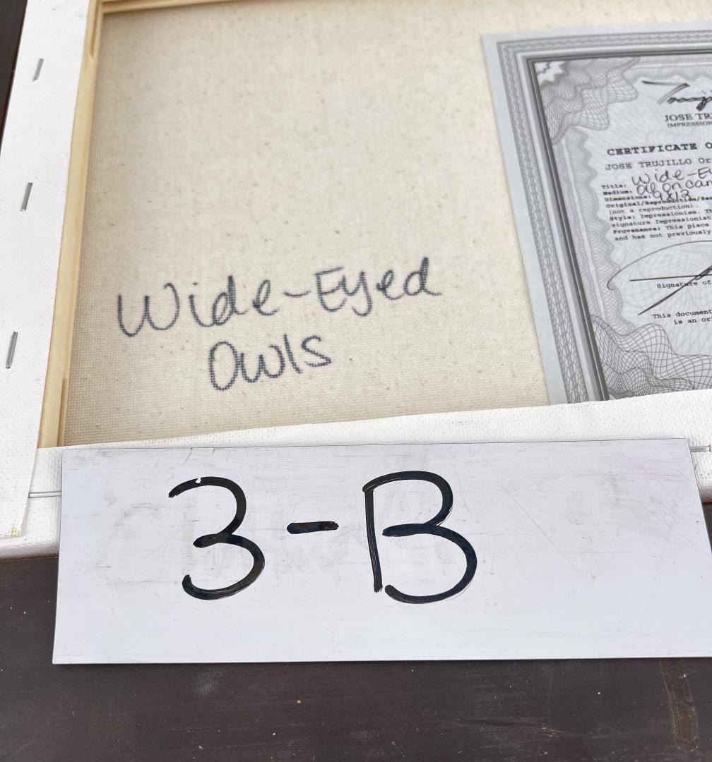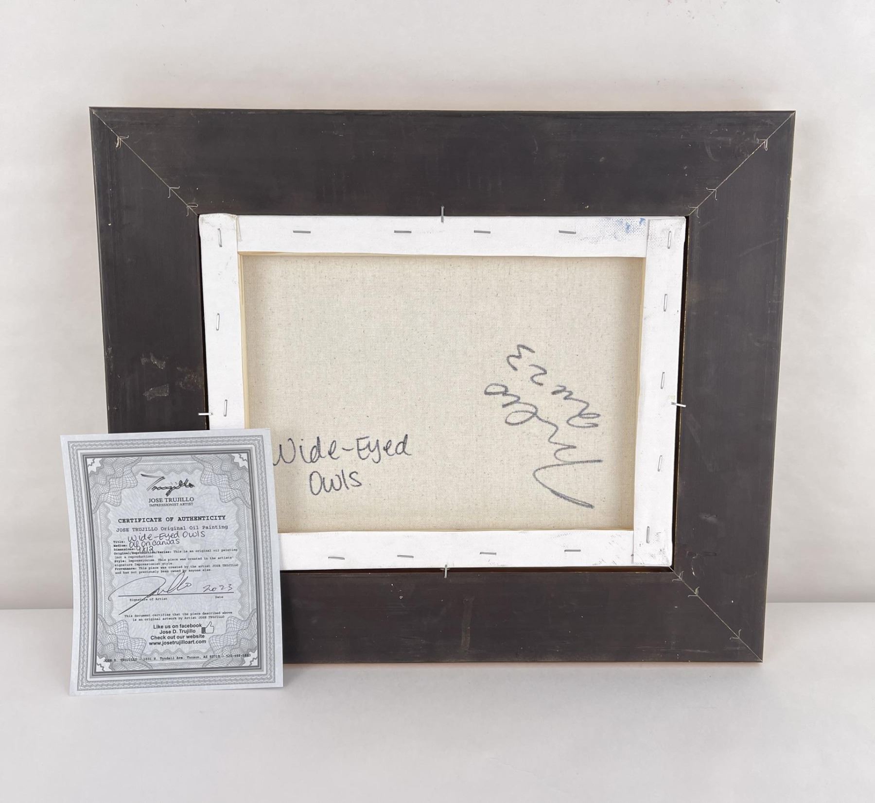 14" by 17" framed. Title is Wide Eyed Owls. Jose Trujillo (1982-Present) Tucson Arizona.