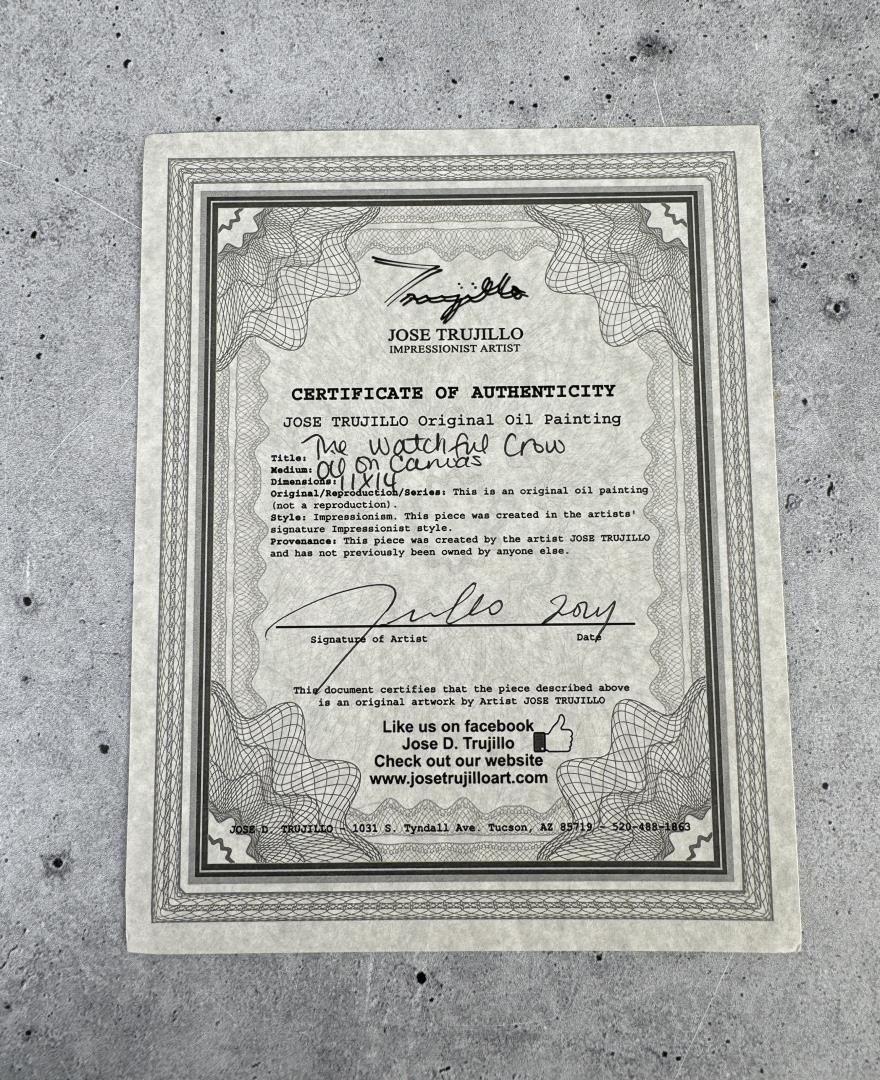 Titled "The Watchful Crow". 14 1/4" by 11" unframed. Jose Trujillo (Born 1982) is active/lives in Arizona. Jose Trujillo is known for Painting.