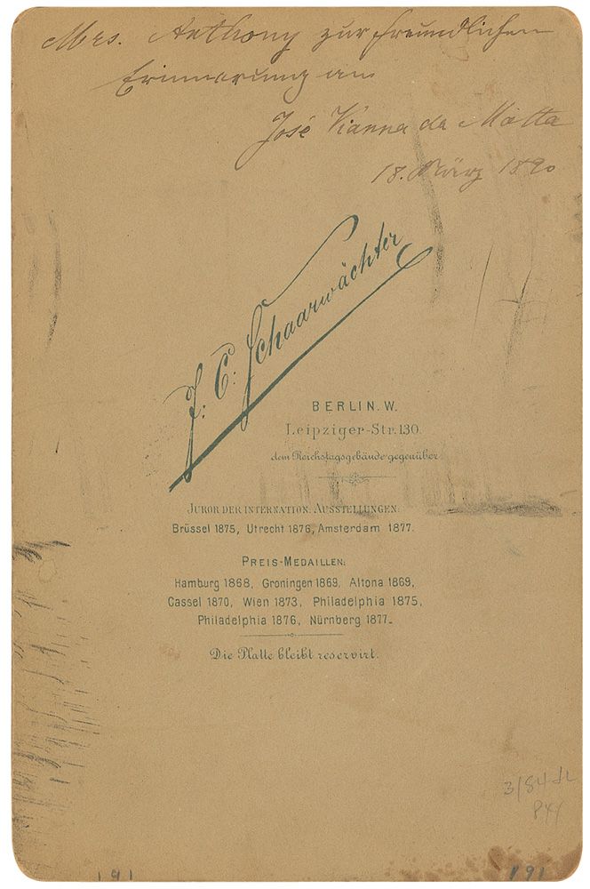 Portuguese pianist and composer (1868–1948) who was one of the last pupils of Franz Liszt. Original 4.25 x 6.5 cabinet photo by J. C. Schaarwachter of Berlin, signed and inscribed on the reverse in black ink. A few bars of music, possibly in his hand, have been penned in ink to the lower right of the image. Scattered surface marks and soiling, and some silvering to dark areas of the image, otherwise fine condition.