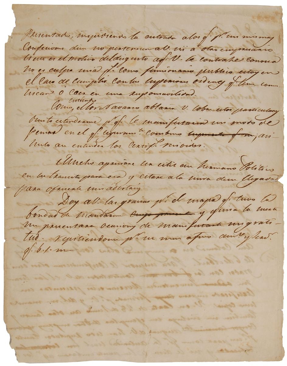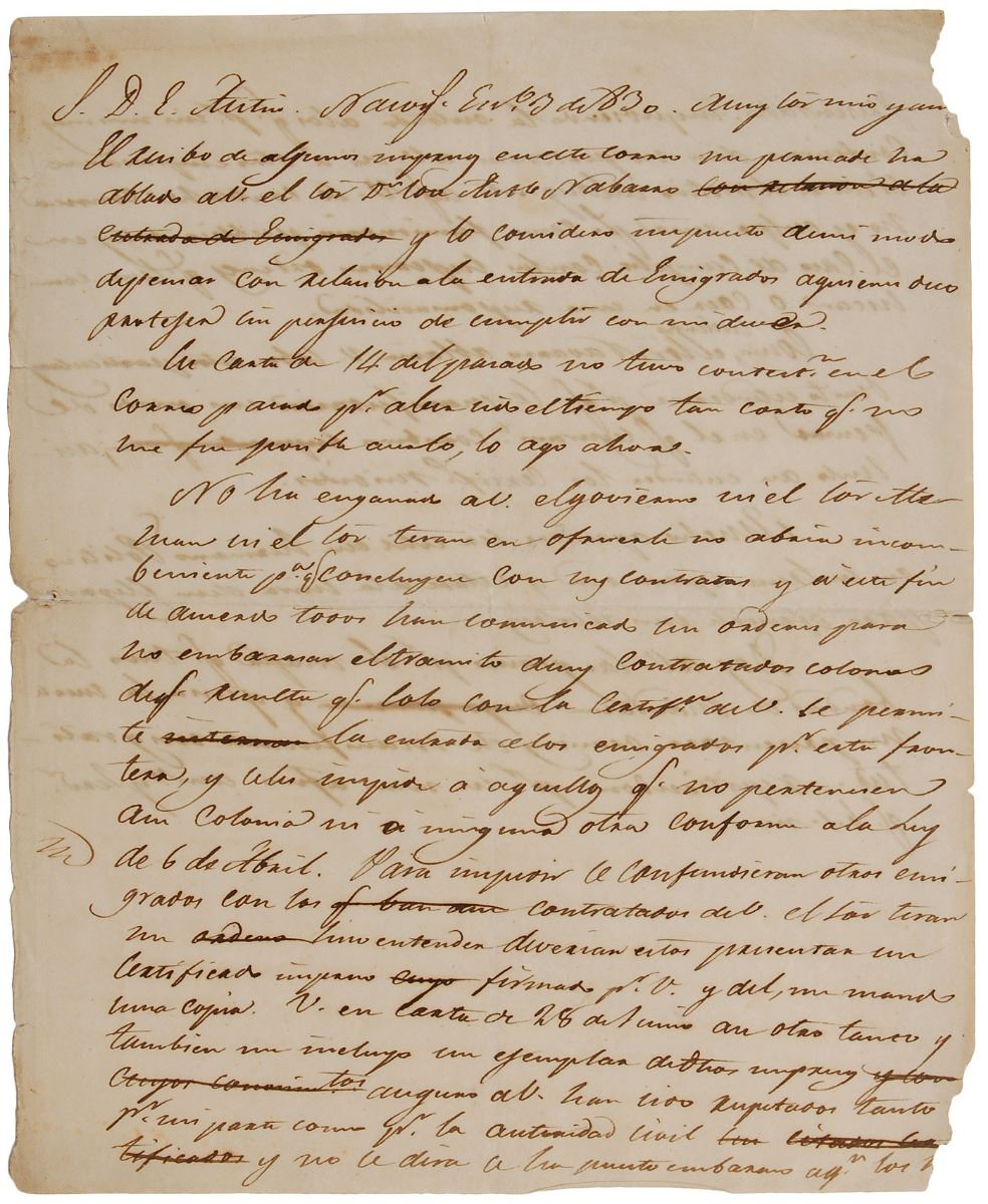 Handwritten letter in Spanish, believed to be by Piedras, unsigned, one page, 8 x 9.75, January 3, 1830 [but likely 1831]. Apparently a draft of a letter to Stephen F. Austin concerning immigration issues, written from Nacogdoches. In part (translated): "The receipt of some printed forms in this mail persuades me that Mr. Jose Antonio Navarro has spoken to you, and I consider him informed about my manner of thinking with regard to the entry of emigrants, whom I am obligated to protect, without prejudice to the fulfillment of my duties. Your letter of the 14th of last month was not answered in the last mail, because the time was so short that it was not possible for me to do so. I do so now. Neither the government nor Mr. Aleman nor Mr. Teran has deceived you in indicating to you that they saw no difficulty in the completion of your contracts, and for this purpose, in order to have them all, they have communicated their orders to pose no obstacles to the transit of your contracted colonists, with the consequence that only with your certification are emigrants permitted entry at this border, and those who do not belong to your colony or to any other are prevented, in accordance with the Law of 6 April. In order to prevent other emigrants from being mixed up with those contracted by you, Mr. Teran gave me to understand that the latter should present a printed certificate signed by you, and he sent me a copy of it, and you another one in a letter of 28 June, and he also enclosed for me a sample of the said printed forms. I assure you that they have been respected both on my part and on that of the civil authorities, and no obstacle will be posed at their post to anyone who has presented them, while preventing the entry of those who by their own admission say that they do not belong to you or to another empresario. If this is the motive for the displeasure you have been caused, know that it is not my fault, since as a public official, I am bound to carry out the higher orders that are communicated to me or fall under my responsibility. Since I understand that Mr. Navarro was going to speak to you about these details, I refrain from going on at greater length, since that would be to lay out a manner of thinking with which you have surely agreed; the certificates received had to be understood in that way. I will greatly appreciate the opportunity to be useful to your brother-in-law on his transit through these parts, and I will be looking out for his arrival in order to pay him my respects. I thank you for the map that you had the kindness to send me, and perhaps fortune will offer me occasions to manifest to you my gratitude.” In fine condition, with areas of slight paper loss along the edges.