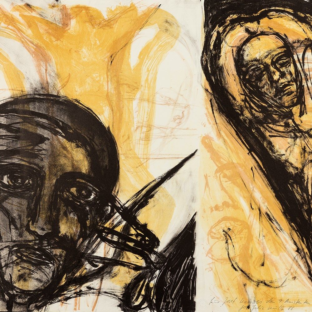 The lithograph in colors is dedictaed, signed and dated lower right in pencil ‘für Josef Kovacs den 1. Assistenten Josef Felix Müller 88‘. The sheet bears a sharp but unobtrusive crease (16.5 cm) extending from the lower edge with an associating small tear (1.3 cm). The overall impression is good. The full sheet image measures 67.3 x 103.3 cm.