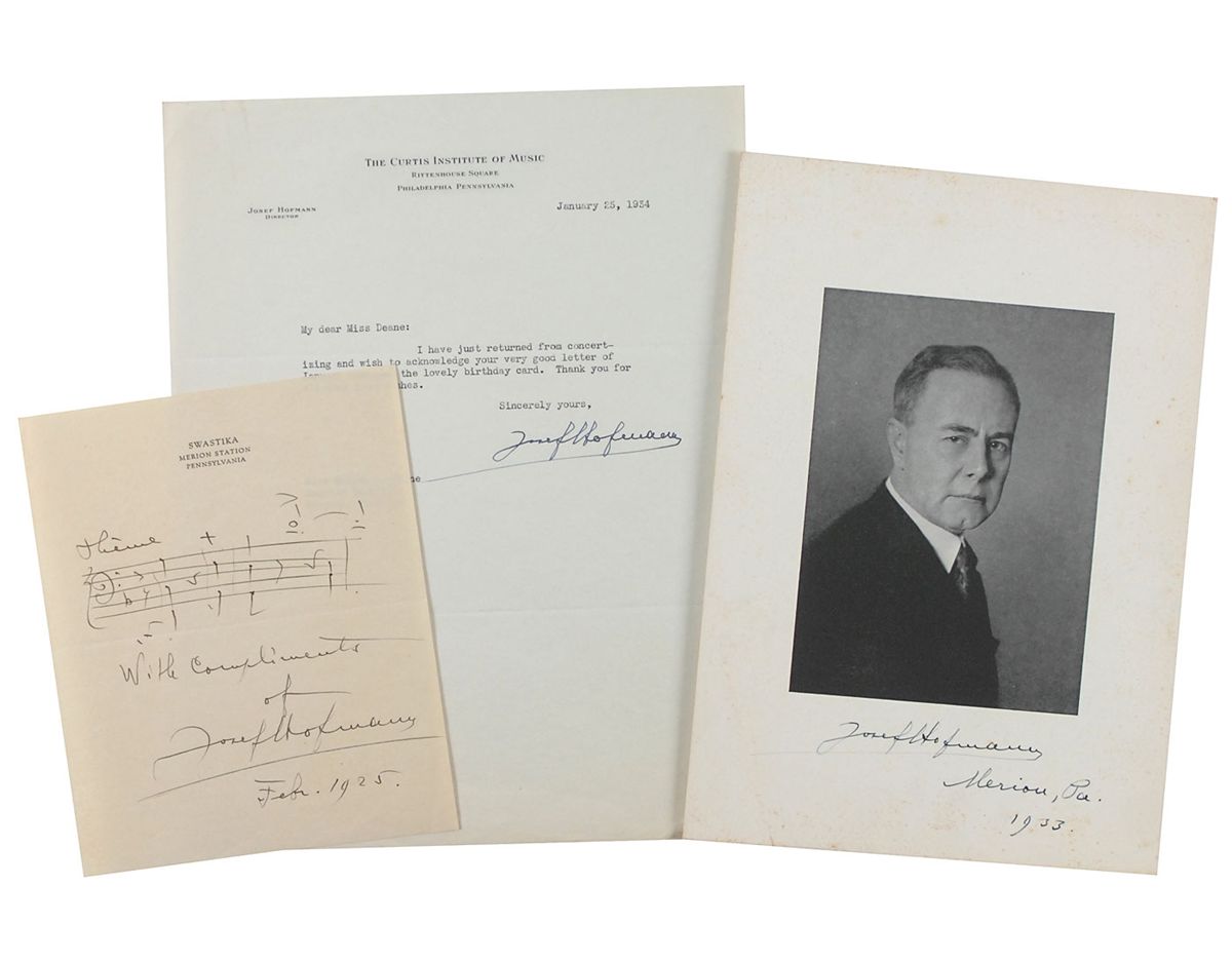 Three items: vintage 7 x 10 photo, signed in the lower border in fountain pen, “Josef Hofmann, Merion, Pa. 1933”; an AMQS on an off-white 5.5 x 7 sheet of Swastika stationery. Hofmann pens several bars from one of his works and signed underneath, “With compliments of Josef Hofman, Febr. 1925”; and a one-page TLS on Curtis Institute of Music letterhead, dated January 25, 1934, sending thanks for a birthday card. In fine condition, with some scattered light foxing to photo.
