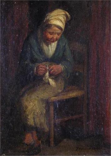 [Dutch 1824-1911] UNTITLED (OLD WOMAN KNITTING) Oil on panel 11 x 8.25 ins. Signed