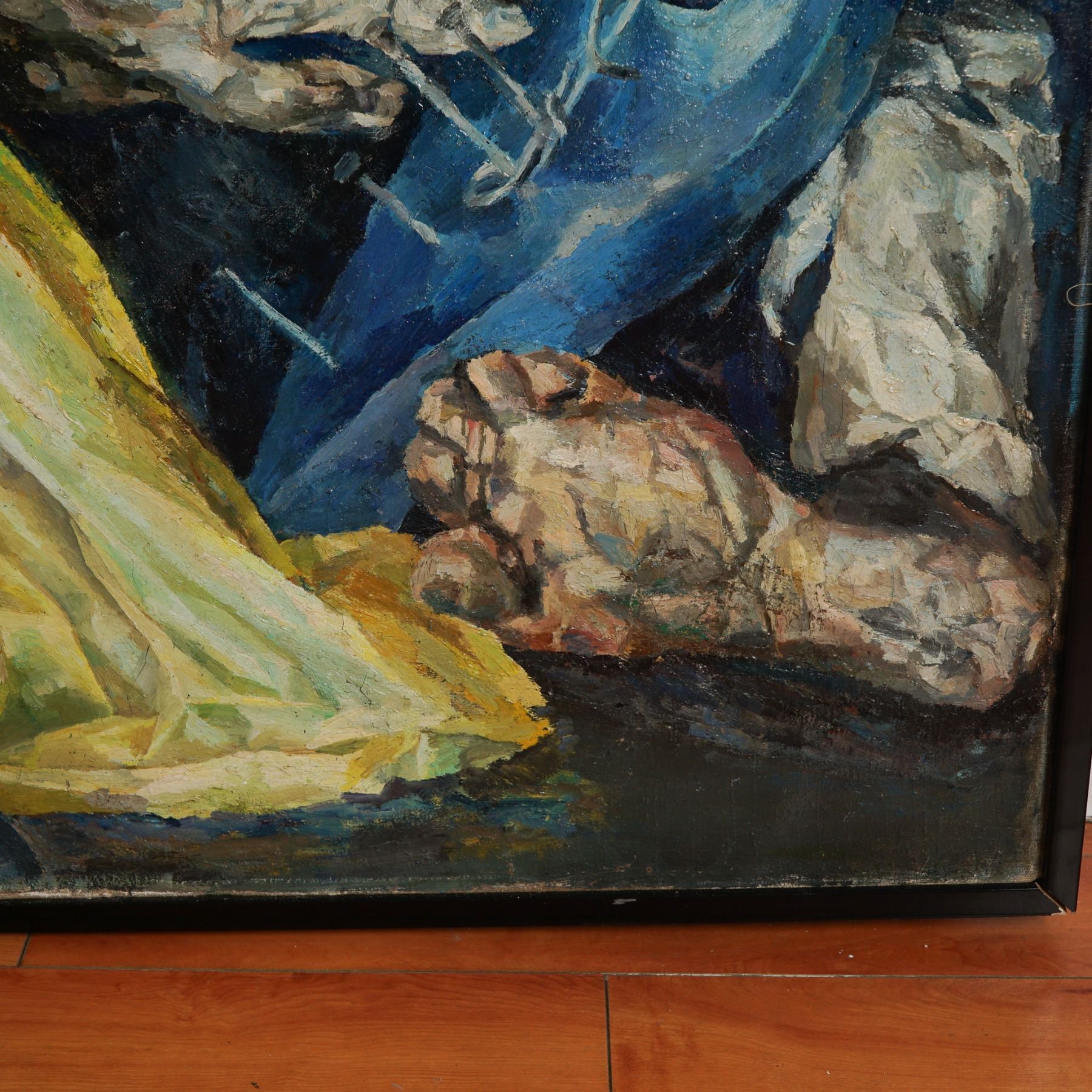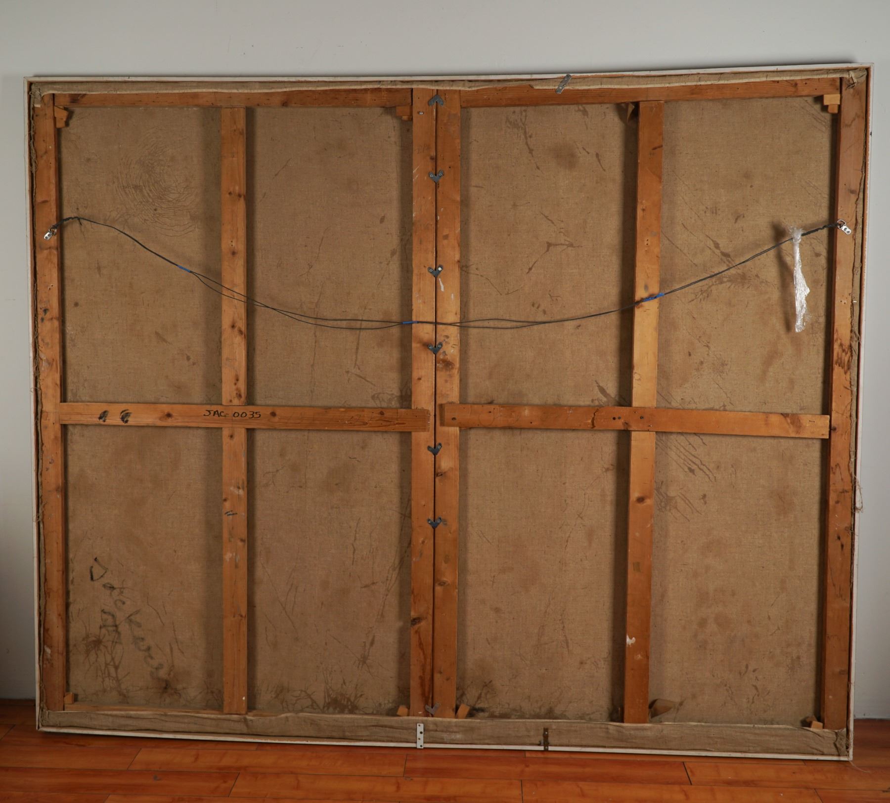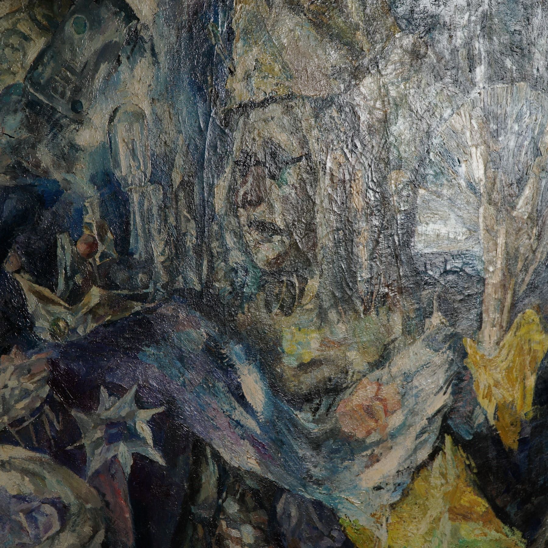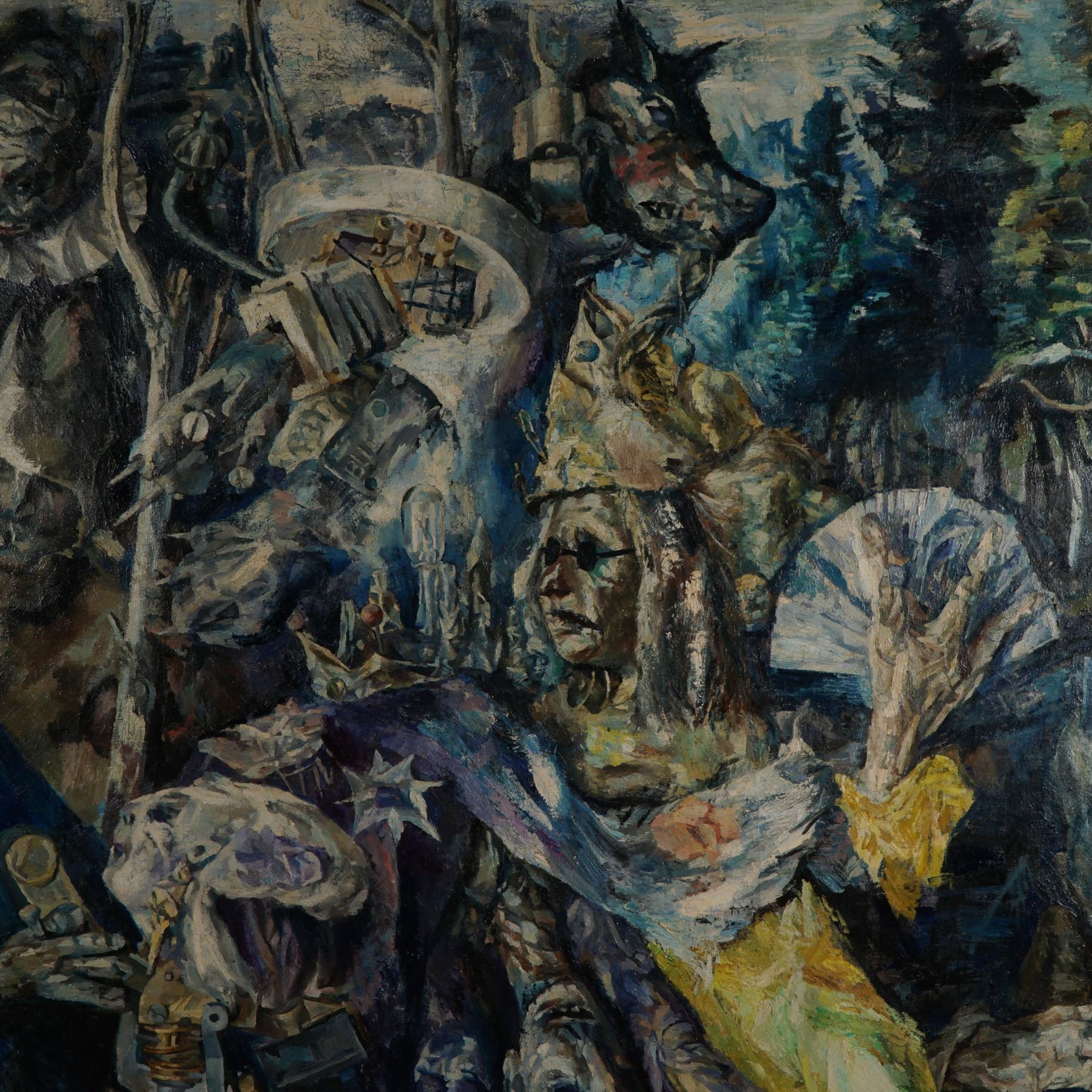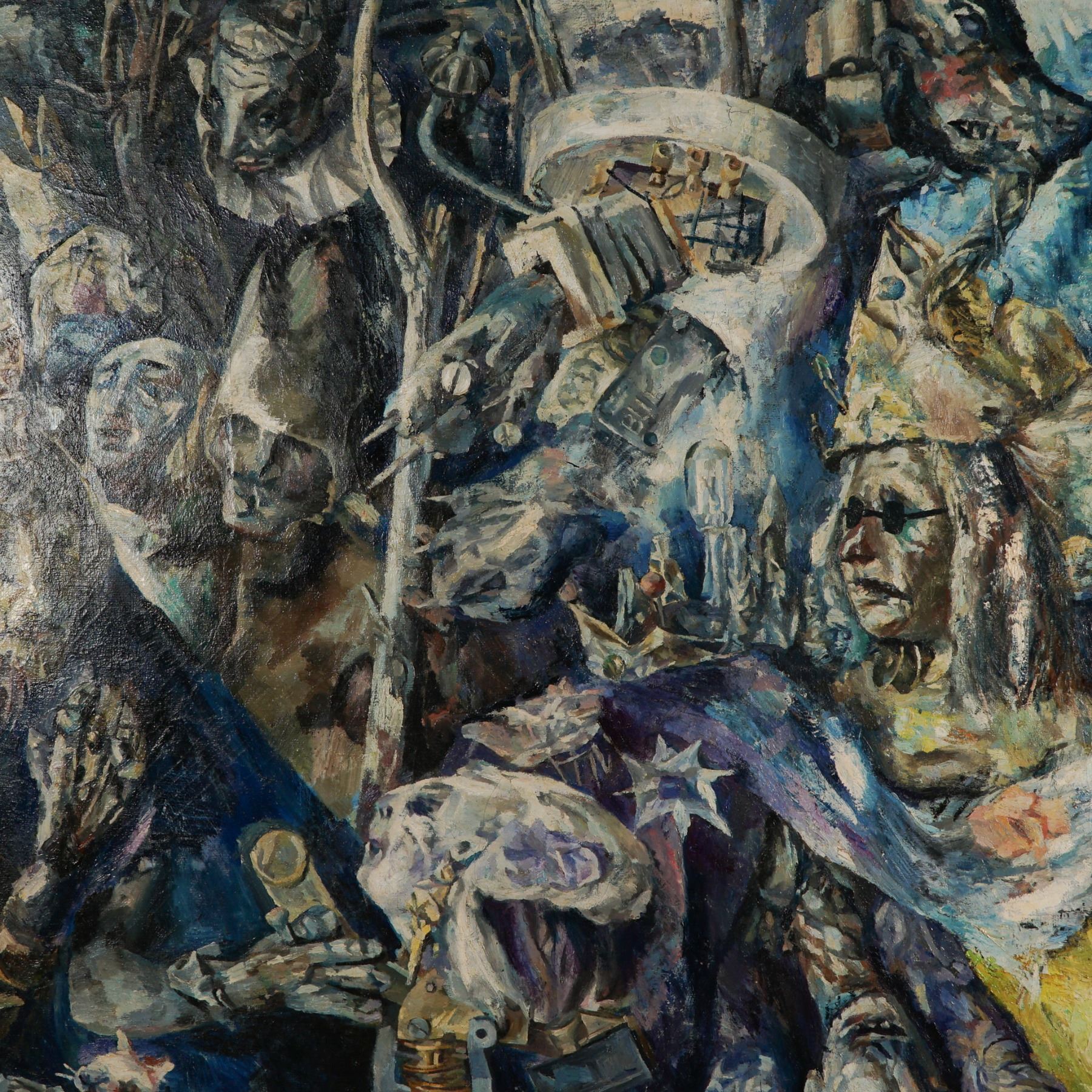 Monumental oil on canvas by Russian-Israeli artist Josef Jackerson, titled Tzar Family. Executed in a bold impasto technique, the composition is densely populated with ghostly figures and symbolic references evoking the tragic fate of the Romanov dynasty. Richly textured and emotionally charged, the painting is rendered in a palette of earthy ochres, ultramarine blues, and somber grays. Figures are layered and contorted with painterly intensity, forming a macabre procession of surreal and historical motifs. The surface shows expressive brushwork and thickly applied paint, creating a dramatic three-dimensional quality. Josef Jackerson is a Russian-born Israeli painter known for his emotionally intense and thematically complex works often addressing political, spiritual, and philosophical themes. His style frequently merges surrealism, symbolism, and expressionism, and he is particularly admired for his monumental narrative compositions that tackle themes of history, religion, and existential struggle. His work has been exhibited internationally and remains highly regarded among collectors of Jewish and Eastern European modernist art. Signature on upper right.